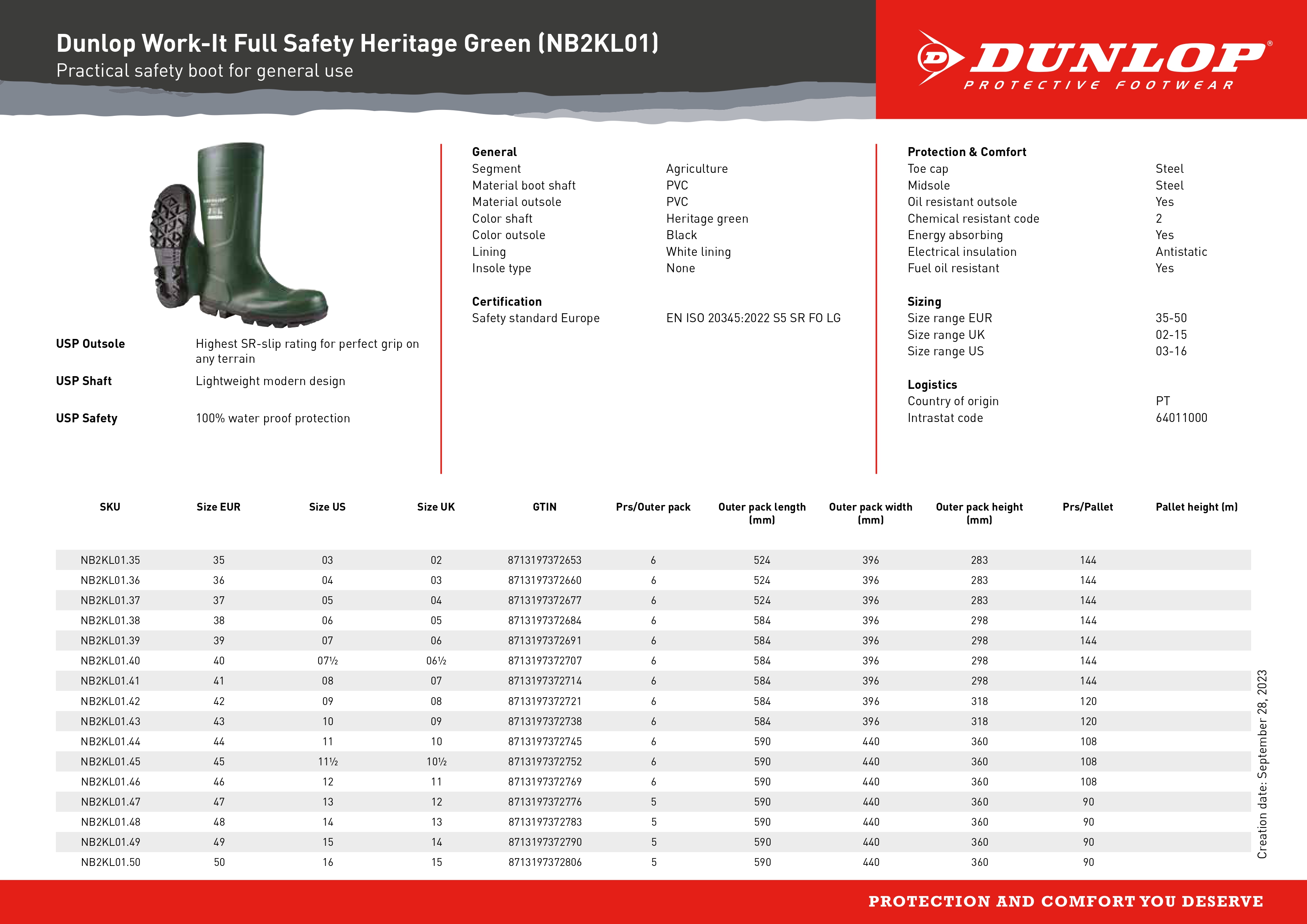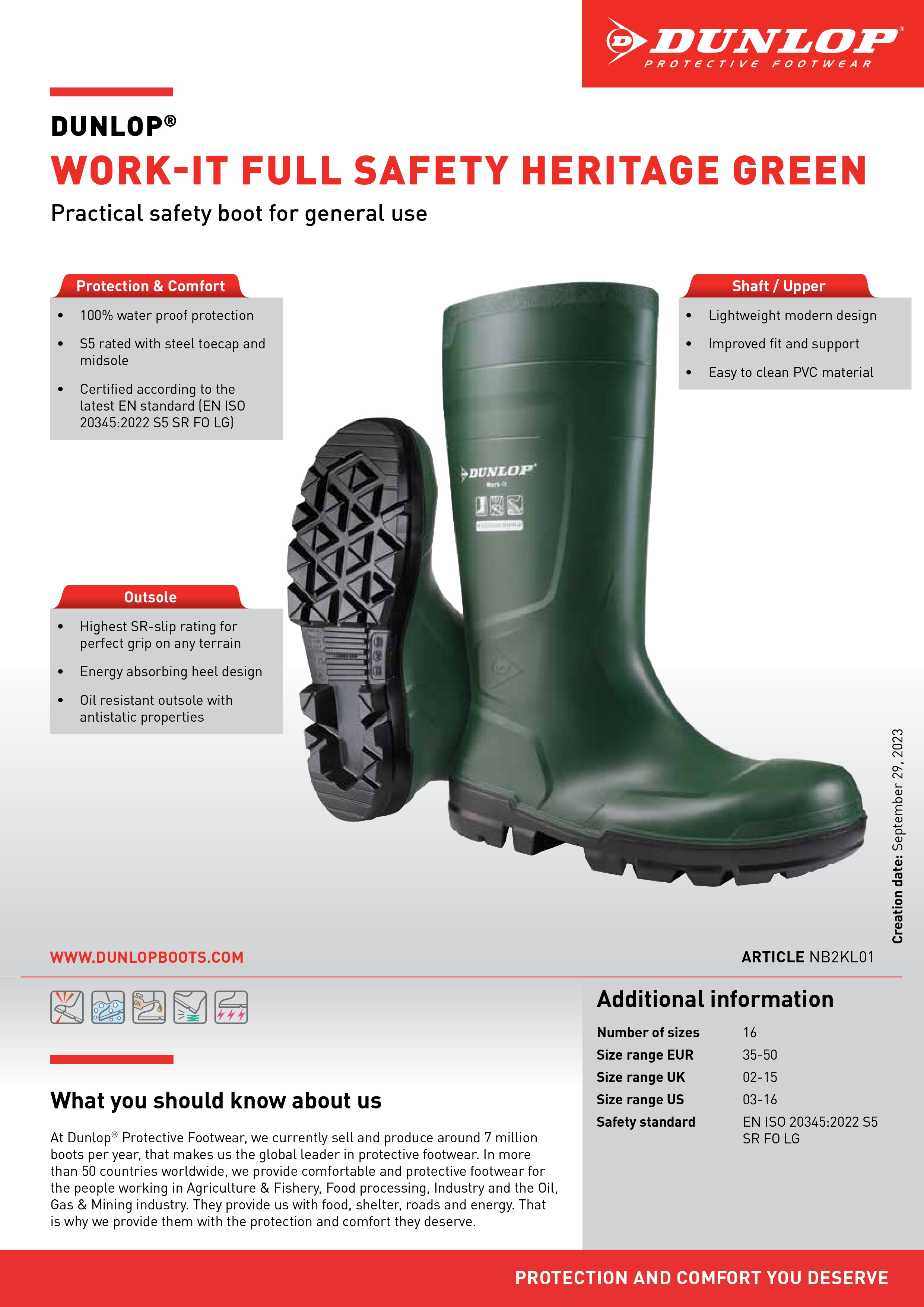 DUNLOP WORK-IT NB2KL01安全水鞋,是一款為多種作業場景保駕護航的優質裝備。它採用100%防水PVC材質,能有效抵禦水浸,保持腳部乾爽。鞋頭與中底配備鋼質材料,具備優異的防砸、防刺穿性能。其鞋底不僅防滑等級高,可在任何地形提供完美抓地力,還具有耐油及防靜電特性。此外,水鞋設計貼心,擁有吸能腳跟​​設計,減輕行走壓力,且鞋身輕巧,方便清潔。尺寸範圍為EUR 35 - 50,滿足不同族群需求,符合歐洲EN ISO 20345:2022 S5 SR FO LG安全標準 ,為工作安全增添有力保障。