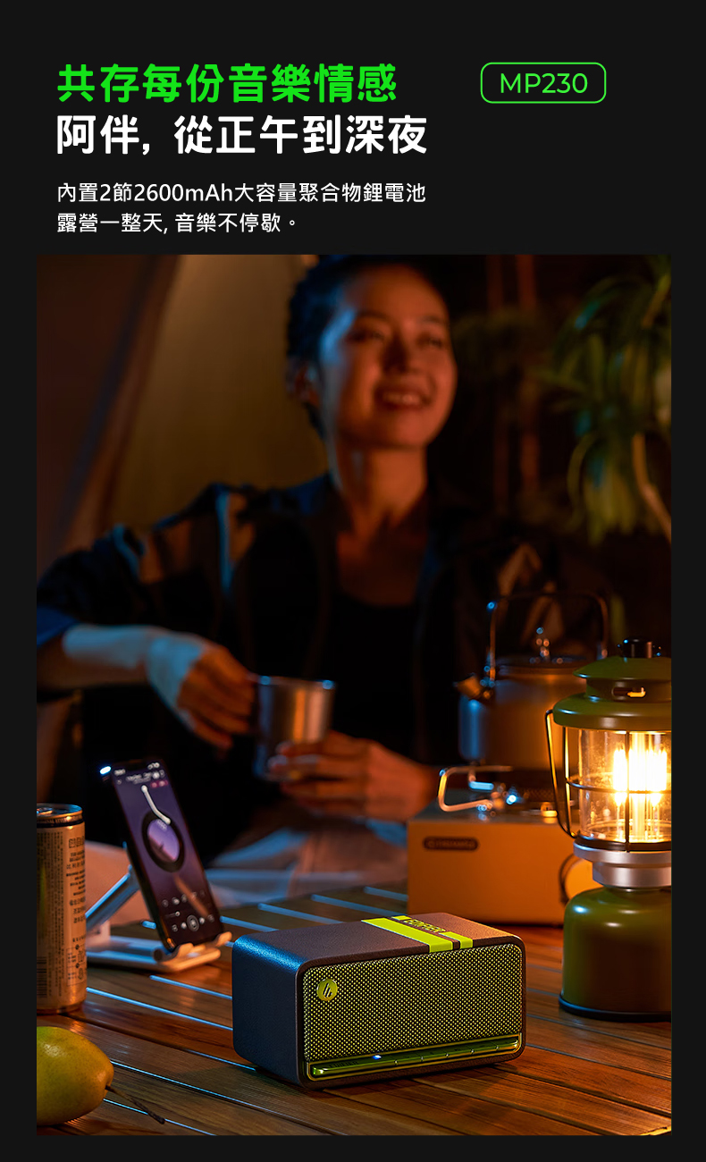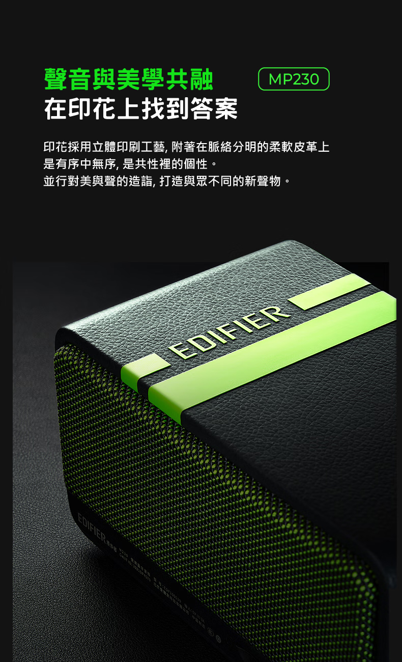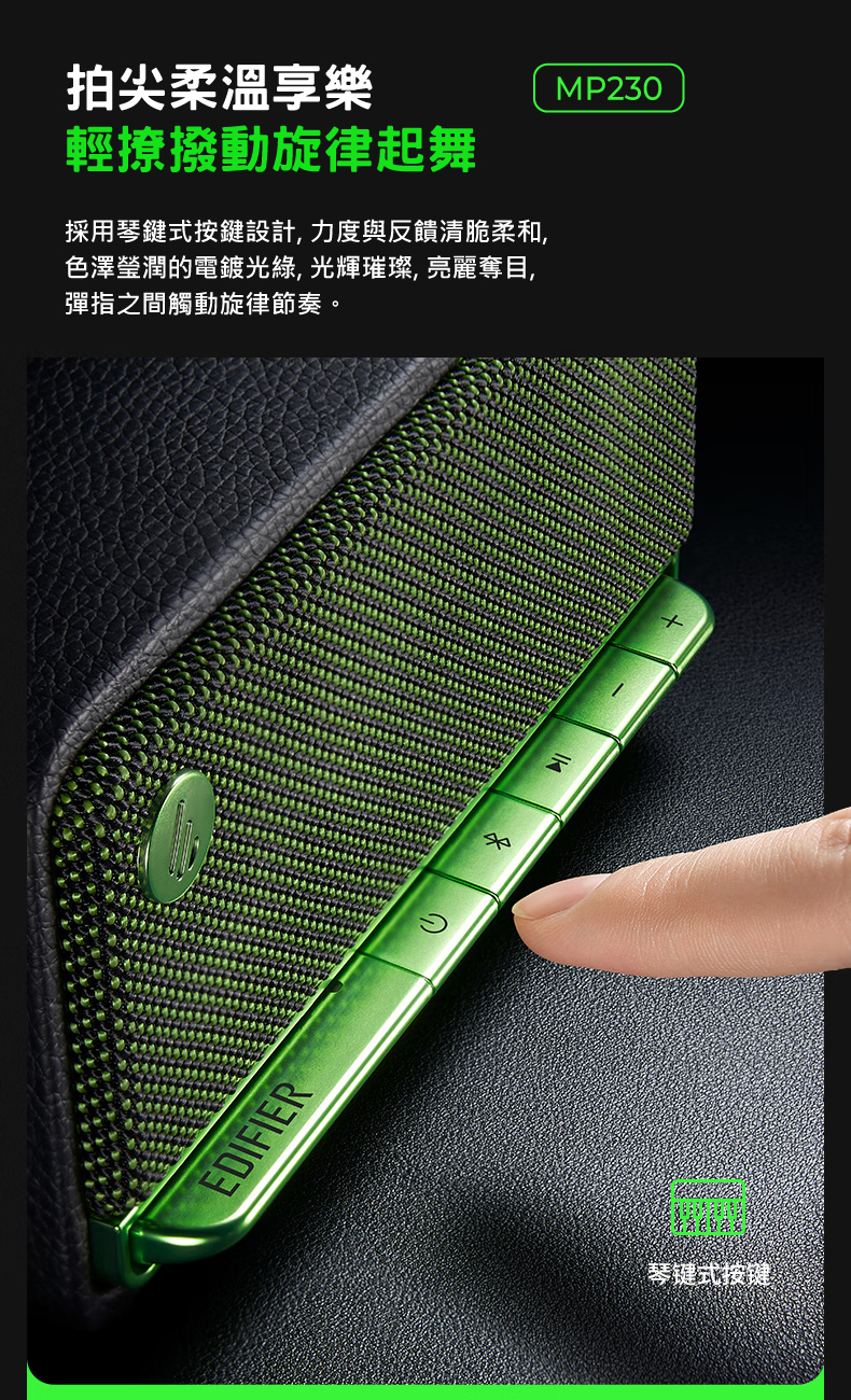 Edifier MP230藍牙喇叭音響,復古外觀設計靈感源自上世紀五、六十年代的收音機,經典的鋼琴鍵按鈕搭配傳奇色調與精緻網面,展現獨特韻味。它內建2500mAh大容量鋰離子電池,滿電狀態下藍牙播放時間可達9小時 。音響採用藍牙5.0技術,傳輸速度快、耗電量低、抗干擾能力強。其立體聲音響系統由兩個48mm全頻驅動單元和集成的大尺寸雙被動輻射器組成,搭配木質箱體,音質飽滿,能營造出廣闊的音場。除藍牙連接外,還支援AUX、USB - C連接埠和TF卡等多種輸入模式,滿足不同場景使用需求 。
