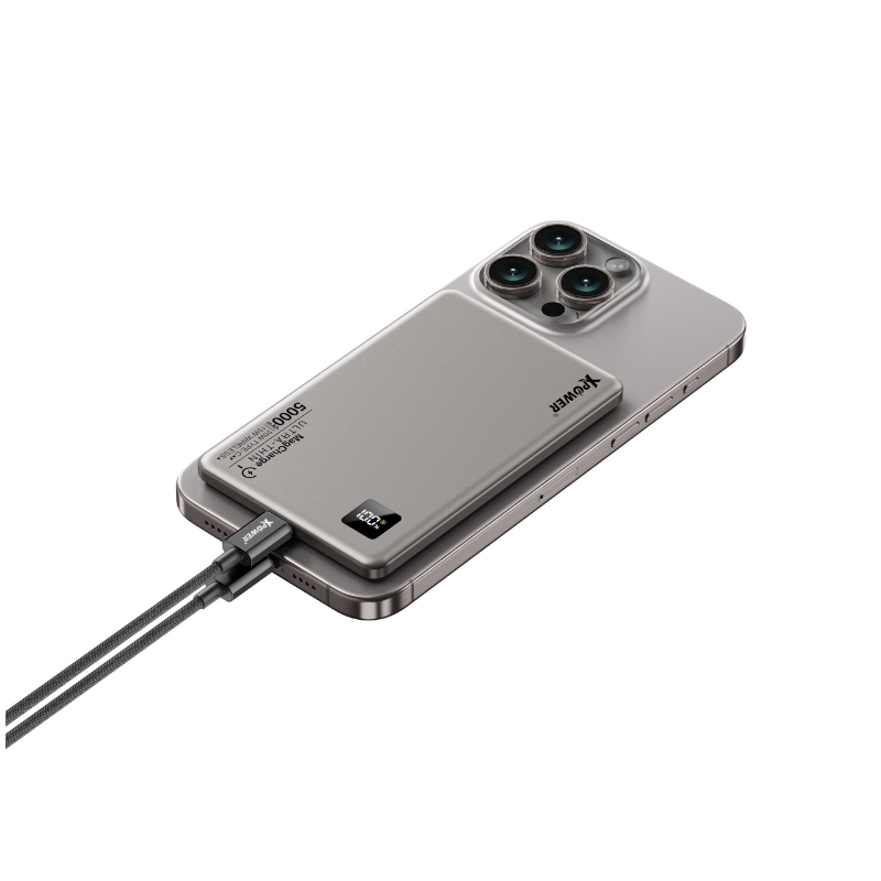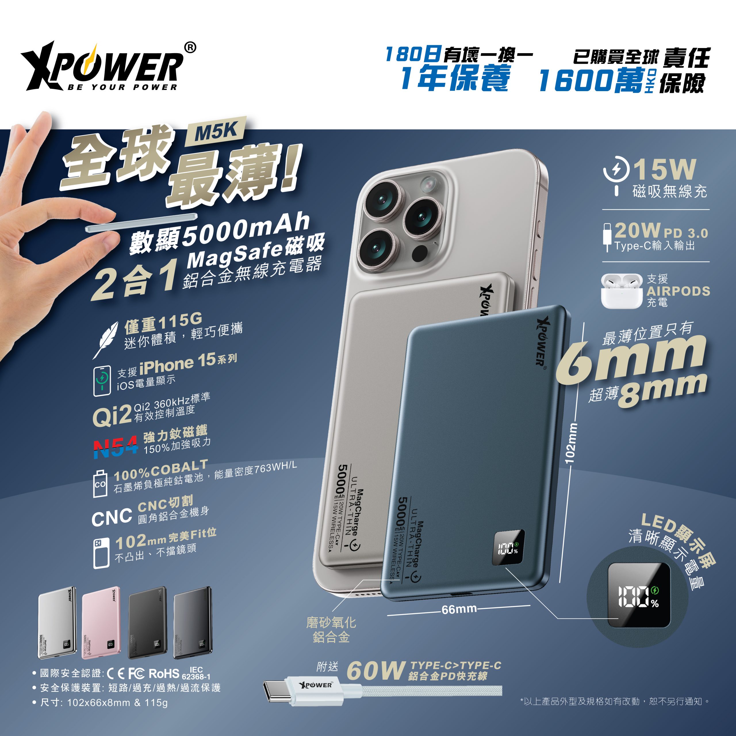 XPower M5K是一款集時尚外觀與強大效能於一身的3合1鋁合金數位外接充電器。其採用CNC切割鋁合金機身,僅重115g,厚度8mm,迷你輕巧,方便攜帶。配備5000mAh石墨烯負極100%純鈷電池,不虛標電量且散熱佳。擁有2個輸出接口,磁吸無線充達15W,支援Qi2無線充規格,能降低溫度,還可快充iPhone15等系列並顯示iOS電量,也支援AirPods無線充電;Type-C介面為20W PD 3.0,輸入輸出皆可。 N54強力釹磁鐵,吸力增強150%,一啪即充超便捷,還附送60W鋁合金Type-C線 ,並具備多重安全保護。