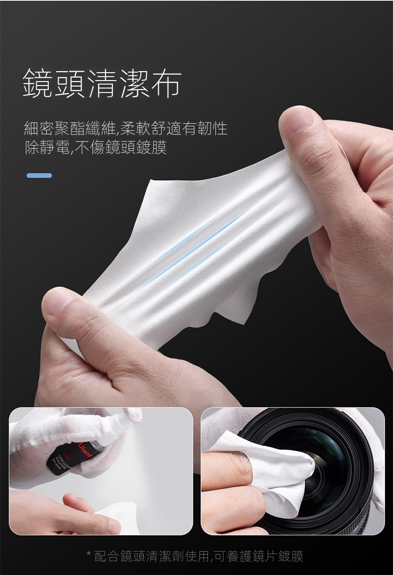 • 聚酯纖維鏡頭清潔布,柔軟且不傷鏡頭鍍膜。