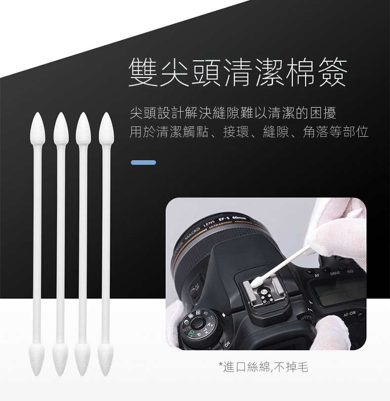 • 雙尖頭清潔棉簽,進口絲綿製成,專門針對縫隙等難以觸及的部位。