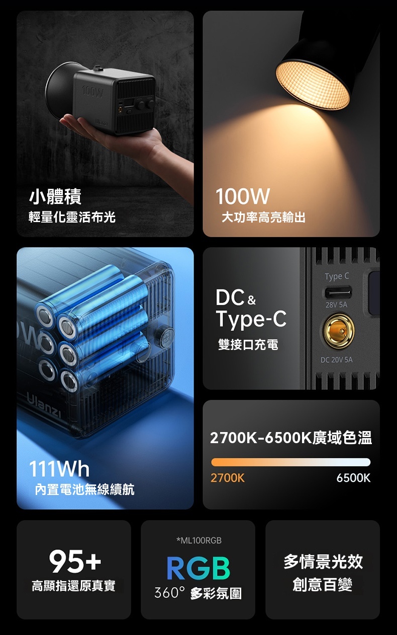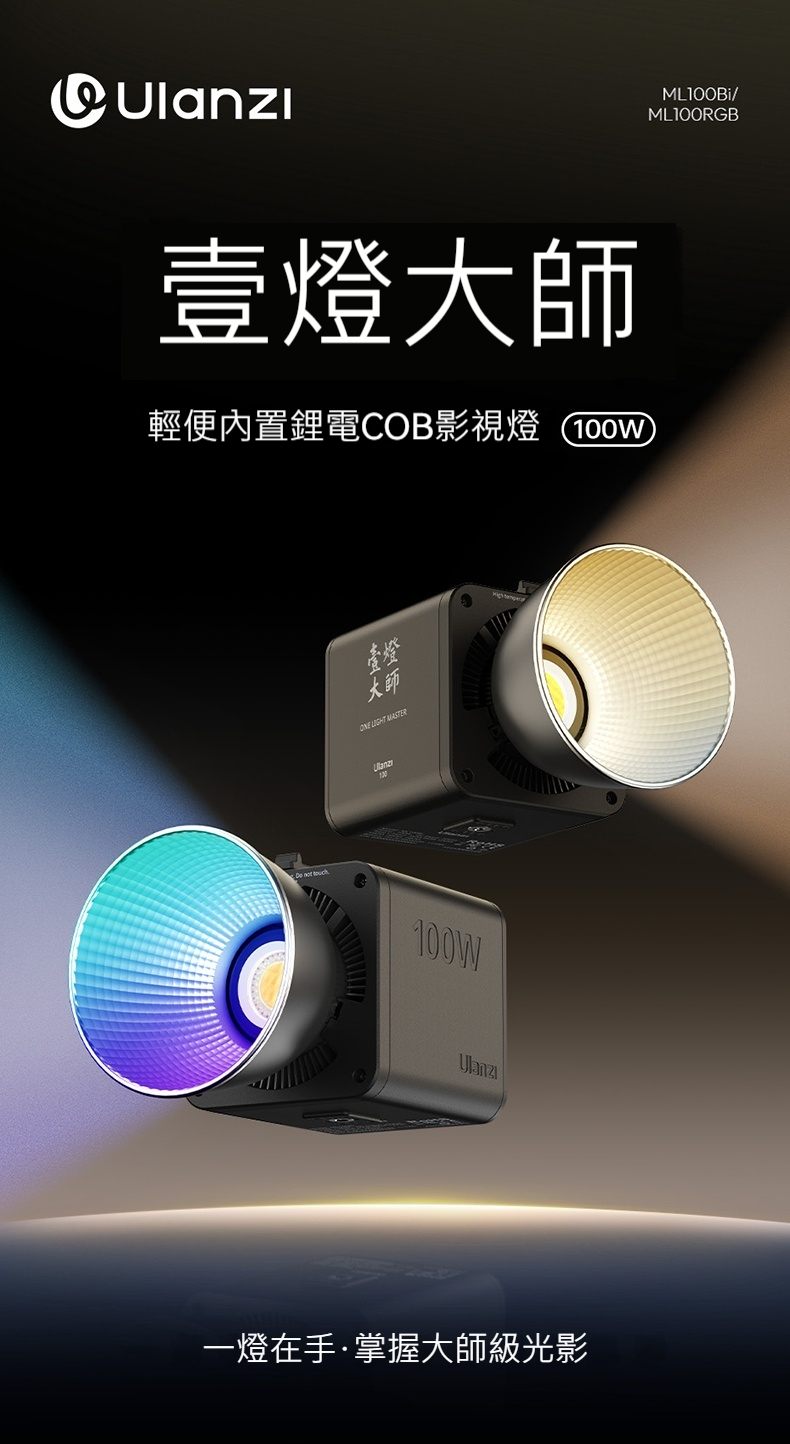 Ulanzi一燈大師100W專業補光燈,為專業創作而生。 100W大功率,輕鬆照亮拍攝場景,即便在光線昏暗的環境,也能讓畫面明亮清晰。具備雙色溫及RGB兩種型號,可隨心所欲調整出理想光線,無論是溫暖氛圍,或是多彩光影效果,都能完美營造。內建電池設計,擺脫線纜束縛,方便攜帶至戶外等不同場景創作。它顯色指數高,能精準還原色彩,讓拍攝對象呈現最真實的色彩狀態,是攝影、直播等領域的得力補光夥伴 。