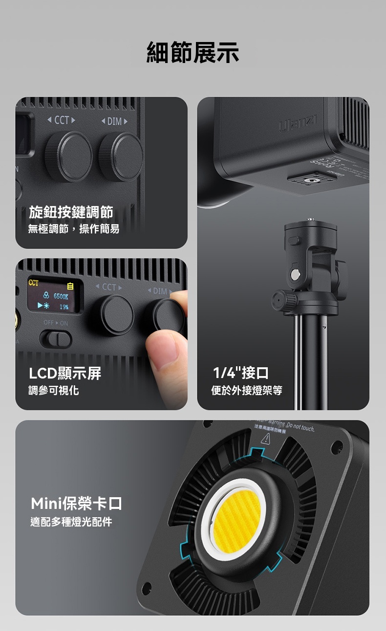 • 專業調光:無段調整亮度,從極弱到極強光順滑過渡,滿足複雜場景光線強度需求。