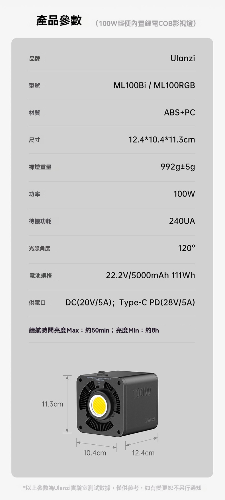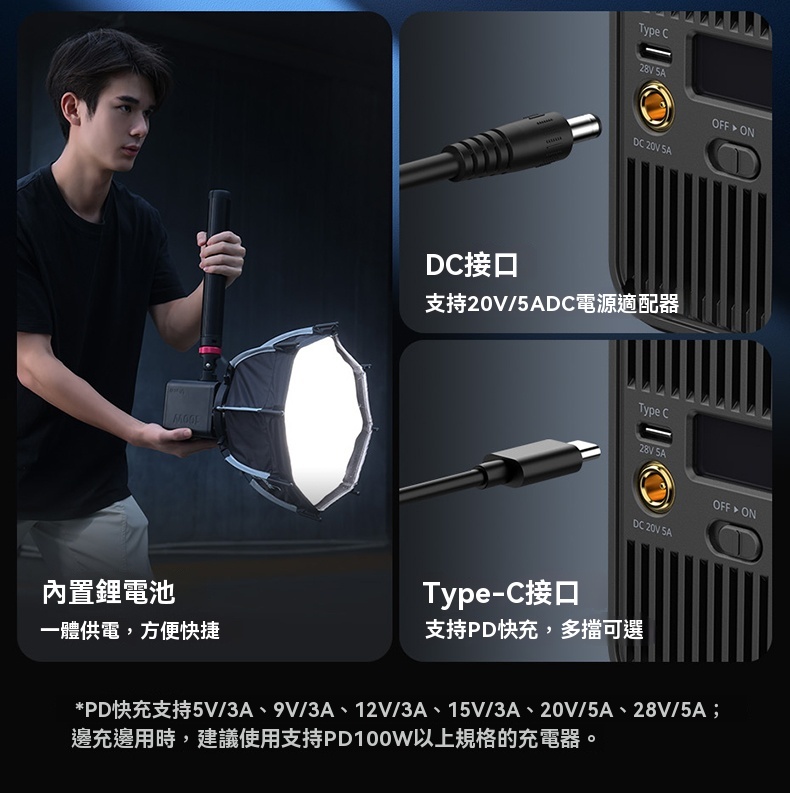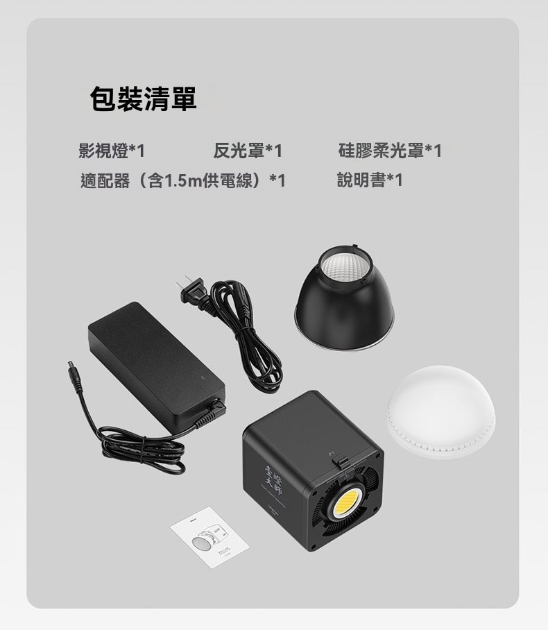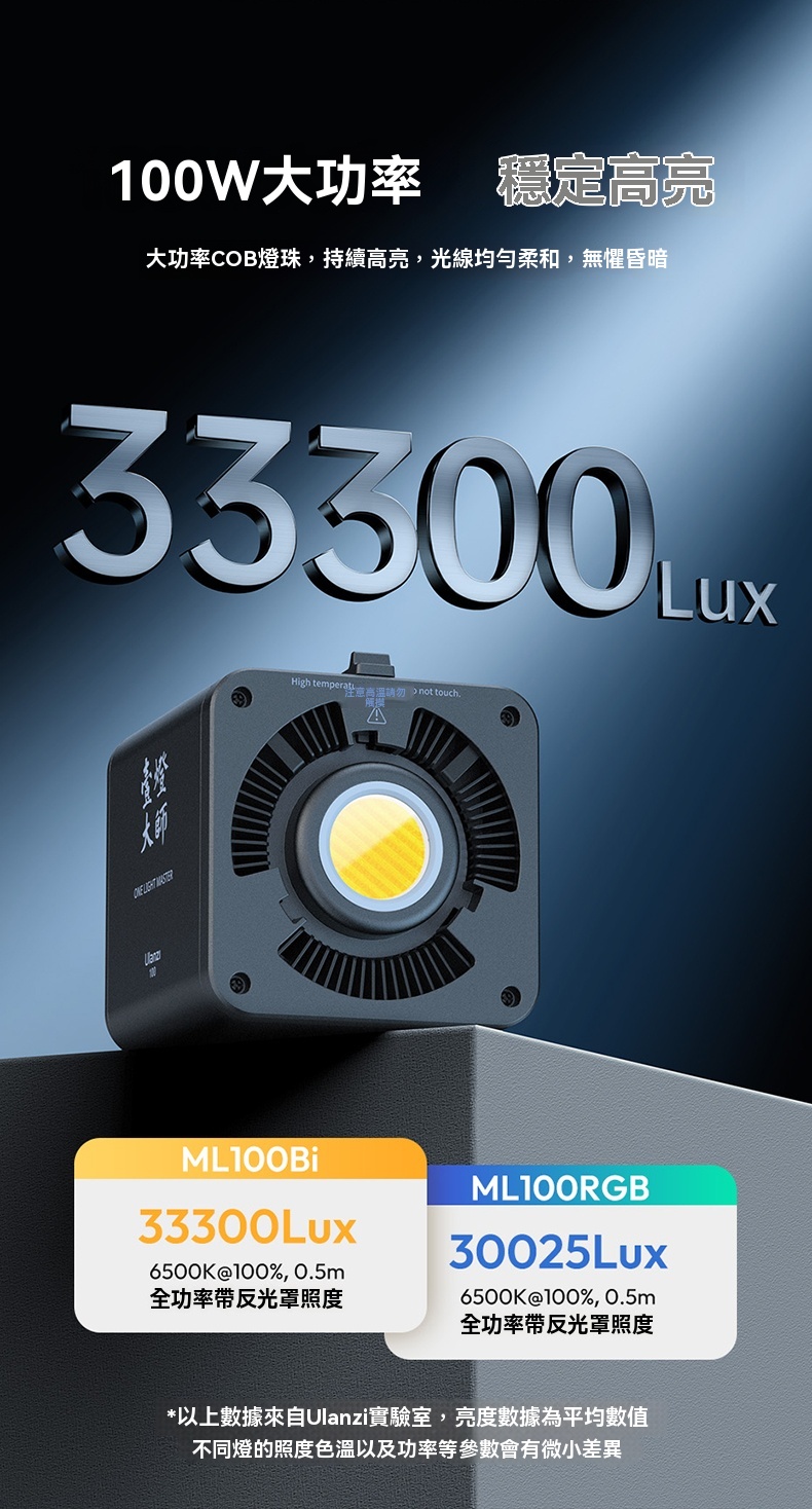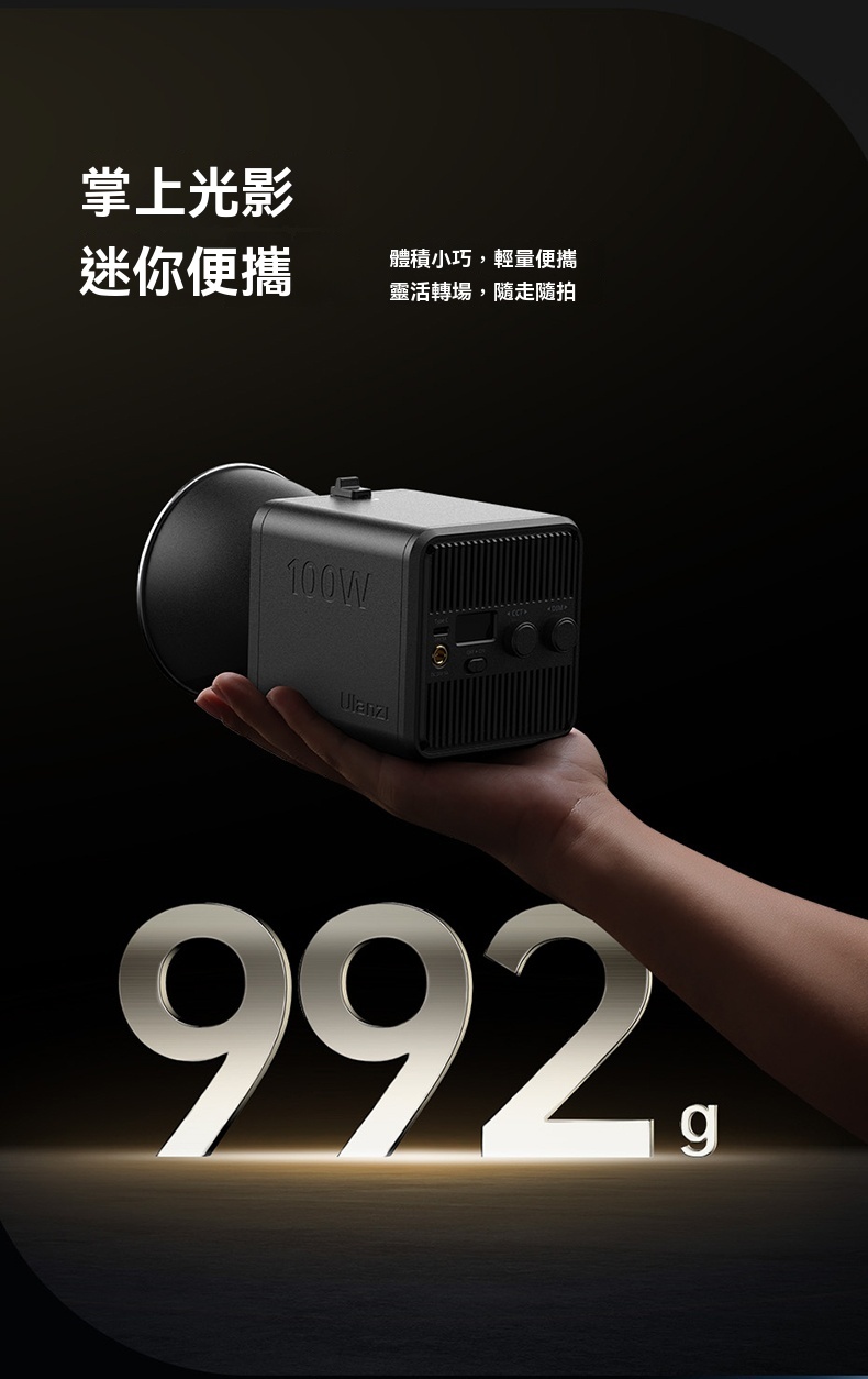 • 高功率輸出:100W大功率,穩定輸出強光,勝任大場景補光,讓畫面光線均勻明亮。