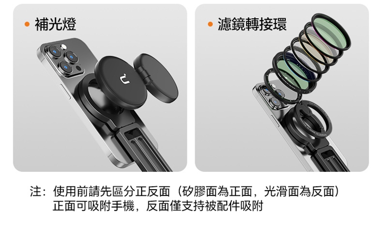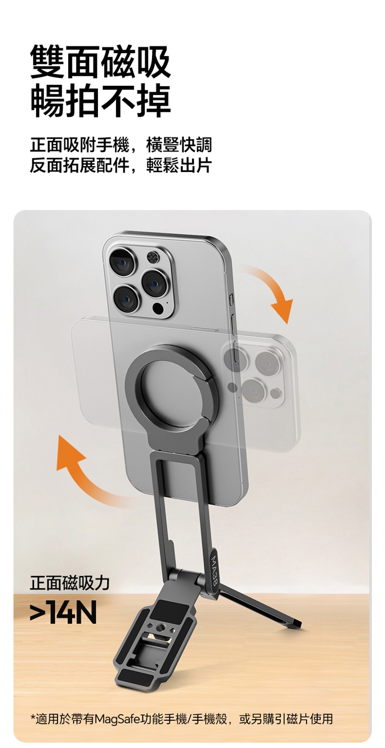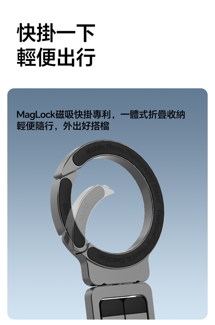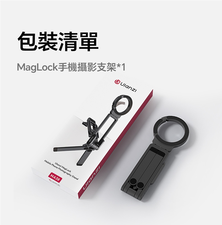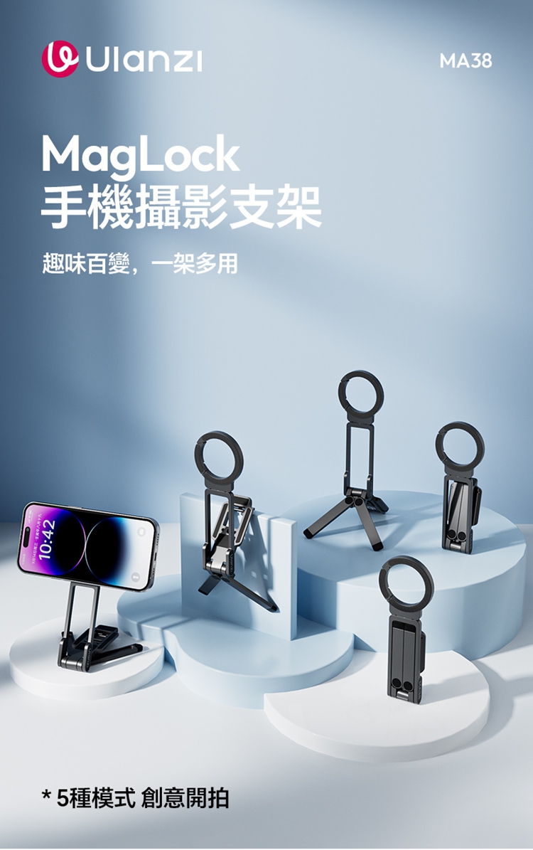 Ulanzi MA38 MagLock Phone Stand是一款支援 MagSafe 的多功能手機腳架,集 5 種模式於一體,含手機支架、手持、三腳架、螳螂及快扣模式,滿足多樣拍攝需求。它超便攜,重 108-109g,折疊後尺寸小巧(約 15.5cm),方便攜帶;雙面磁吸設計,磁力>14N,正面吸手機、背面接配件,可快速切換橫豎屏,還能吸附於冰箱等光滑金屬表面。腳架支援 180° 旋轉調整角度,三角底座防滑穩固,最大承重 450g;內置隱藏掛鉤,可掛在顯示器等物體實現高角度拍攝,底座還兼容 Arca-Swiss 快裝系統,可接專業三腳架雲台,適合創作者戶外或桌面拍攝使用。