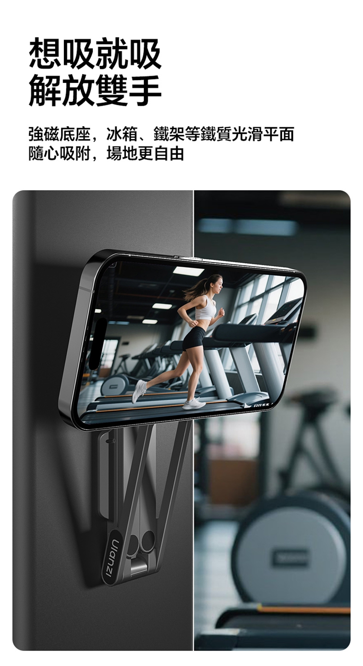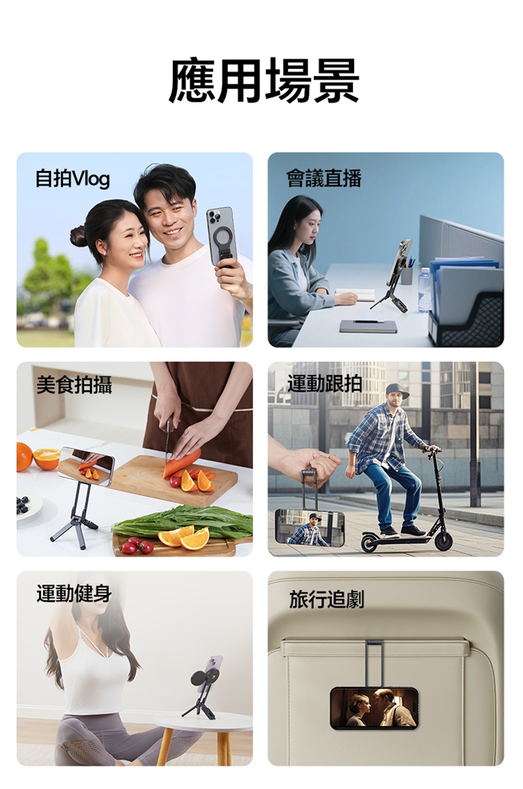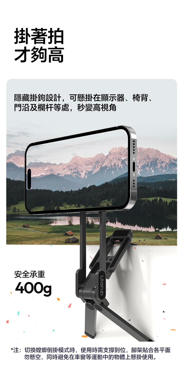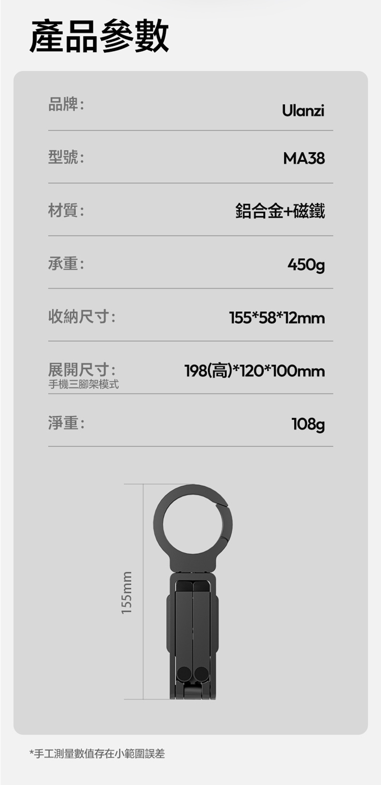 Ulanzi MA38 MagLock Phone Stand是一款支援 MagSafe 的多功能手機腳架,集 5 種模式於一體,含手機支架、手持、三腳架、螳螂及快扣模式,滿足多樣拍攝需求。它超便攜,重 108-109g,折疊後尺寸小巧(約 15.5cm),方便攜帶;雙面磁吸設計,磁力>14N,正面吸手機、背面接配件,可快速切換橫豎屏,還能吸附於冰箱等光滑金屬表面。腳架支援 180° 旋轉調整角度,三角底座防滑穩固,最大承重 450g;內置隱藏掛鉤,可掛在顯示器等物體實現高角度拍攝,底座還兼容 Arca-Swiss 快裝系統,可接專業三腳架雲台,適合創作者戶外或桌面拍攝使用。