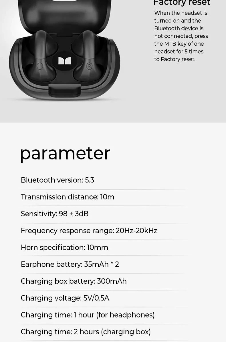 MONSTER Open Ear101 開放式藍牙耳機採用定向空氣傳導與耳掛式設計,非入耳佩戴,搭配 10mm 喇叭單元,支援 20Hz-20kHz 頻率響應與 98±3dB 靈敏度,可提供 HiFi 音質,適合日常、手機連接及運動場景。耳機搭載藍牙 5.3 版本,傳輸距離約 10 米,支援無線連接與 APP 控制,附麥克風可通話,也具備防水功能,配備控制按鈕可調整音量。續航上,單耳電池 35mAh,滿電約 1 小時,50% 音量下可播放 6 小時、通話 4 小時;300mAh 充電盒滿電需 2 小時,可為耳機充電約 3 次,整體重量約 40.2g(耳機 4.6g + 充電盒 31g),整體重量約 31g。