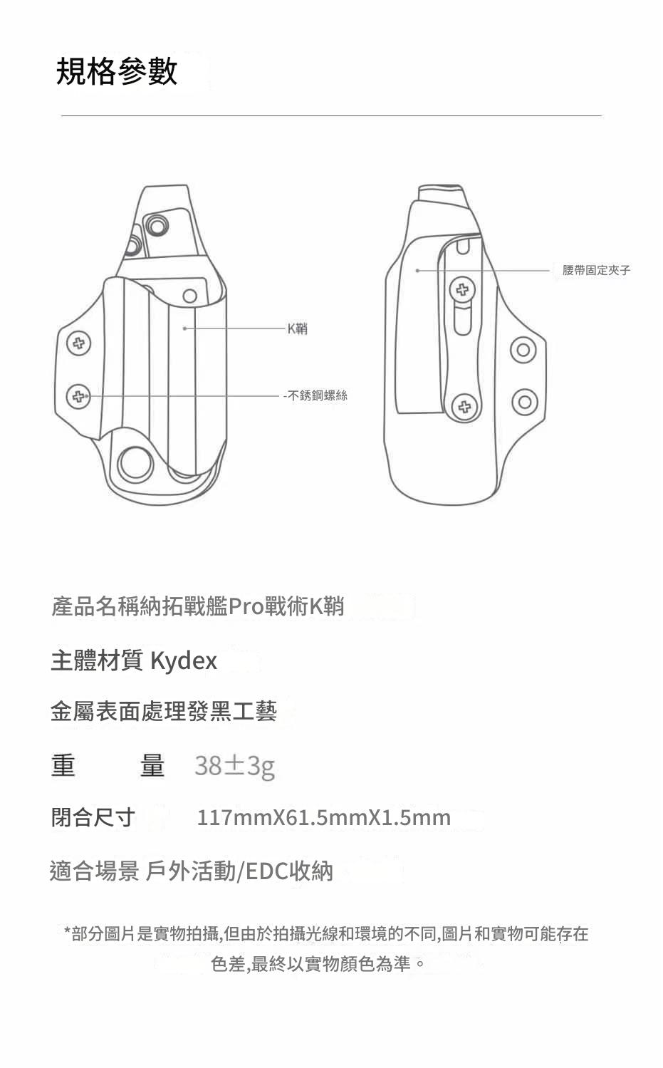 納拓戰艦PRO多功能刀卡鞘採用1.5mm厚Kydex熱塑硬板,專為戰艦Pro工具鉗量身打造,輕量耐用且抗衝擊不變形,適應各種高低溫環境。緊密貼合設計確保牢固不晃動,有效保護工具。配有不銹鋼螺釘固定夾子,可穩固掛載於腰帶,隨身攜帶方便快捷。防脫滑設計讓您在高強度作業時無需擔心脫落問題。此款K鞘適合戶外活動及EDC日常收納,是您不可或缺的戰術配件。