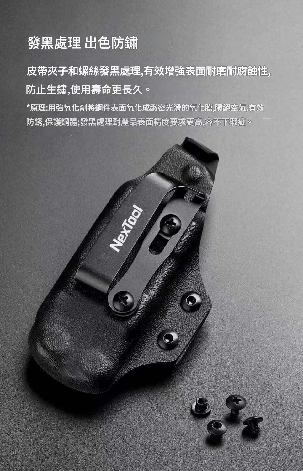 • 腰帶固定夾子採用不銹鋼螺釘,確保長期使用不會鬆動。