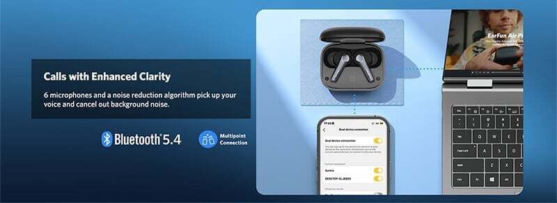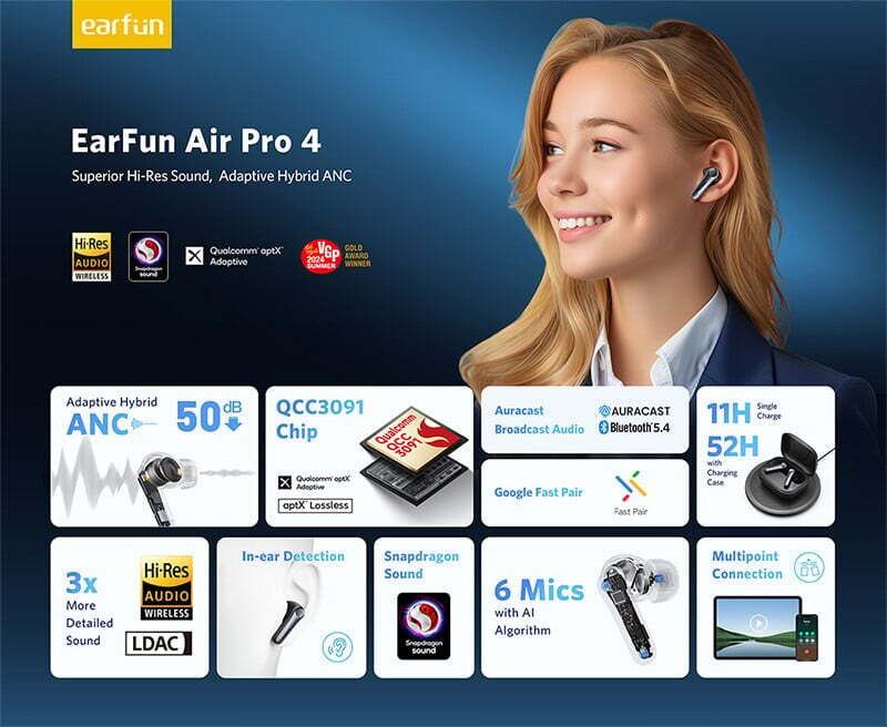 EarFun Air Pro 4 LE-audio ANC 真無線藍牙耳機是一款高效能的音訊裝置。它採用最新的 LE Audio 技術與 LC3 編解碼器,支援藍牙 5.4,搭配高通 QCC3091 晶片,提供 aptX Lossless 無損音訊傳輸。耳機配備 10mm 複合動圈單元,支援 Hi-Res Audio 認證,音質出色。其 QuietSmart™ 3.0 混合式主動降噪功能最高可達 50dB,同時具備 IPX5 防水等級,適合運動使用。耳機續航力達 11 小時,充電盒額外提供 41 小時,支援無線充電和快速充電。此外,它還支援多點連接、Auracast™ 廣播音訊技術,以及增強型 6-mic 陣列,通話清晰。