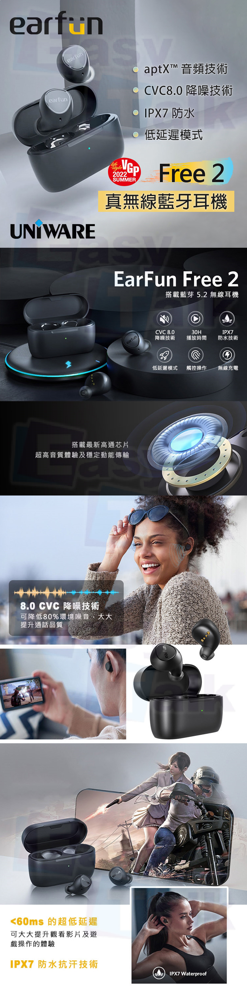 EarFun Free 2s 是一款出色的電競真無線藍牙耳機。它支援 aptX 音訊編碼,能提供高音質、低延遲的音訊體驗,遊戲影音沉浸感十足。擁有 7 小時的單次續航,搭配充電倉能滿足更長時間使用。耳機具備 IPX7 級防水,可抵禦汗水和雨水。也支援藍牙 5.2,連線穩定快速。此外,透過 EarFun audio APP 可進行 EQ 調節等個人化設置,智慧觸控操作方便快捷,為使用者帶來優質的使用感受。