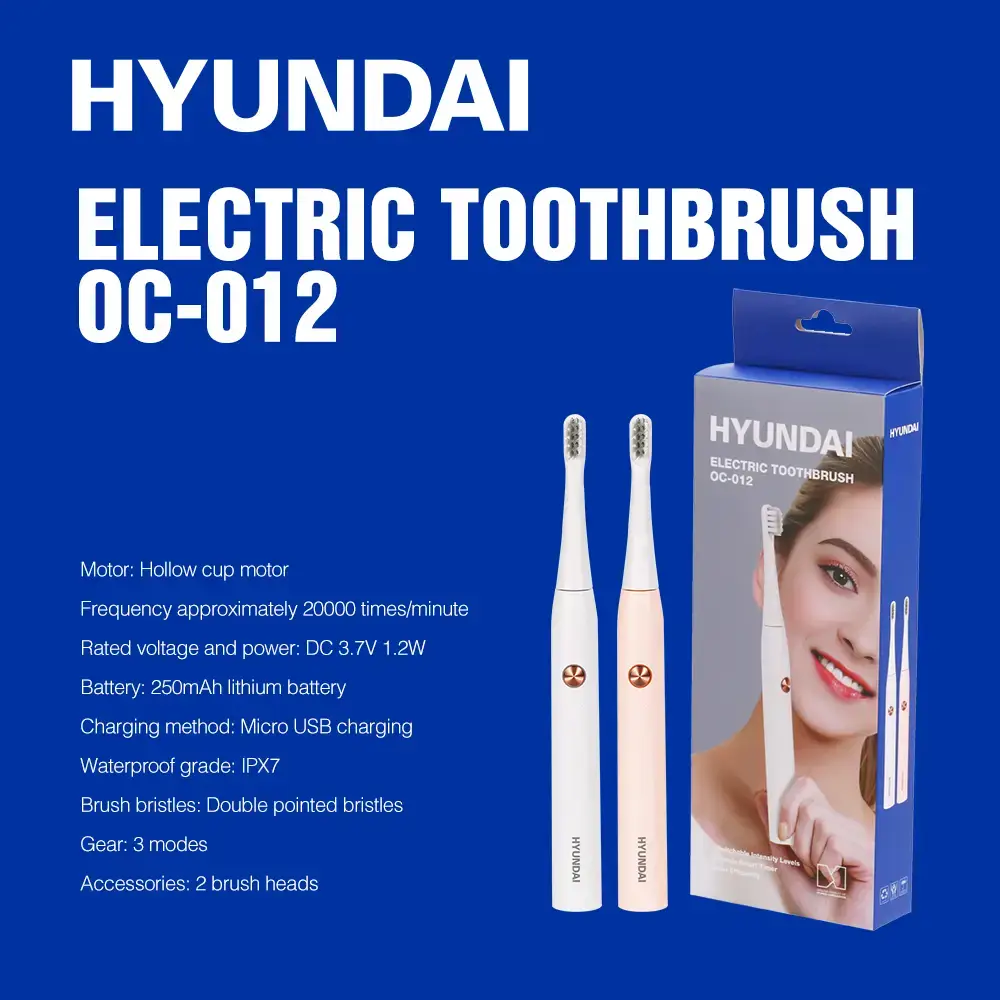 Hyundai OC012B 雙尖刷毛電動牙刷 - 刷頭 | IPX7防水等級 | 三種刷牙模式 | 配兩個刷頭 | 香港行貨