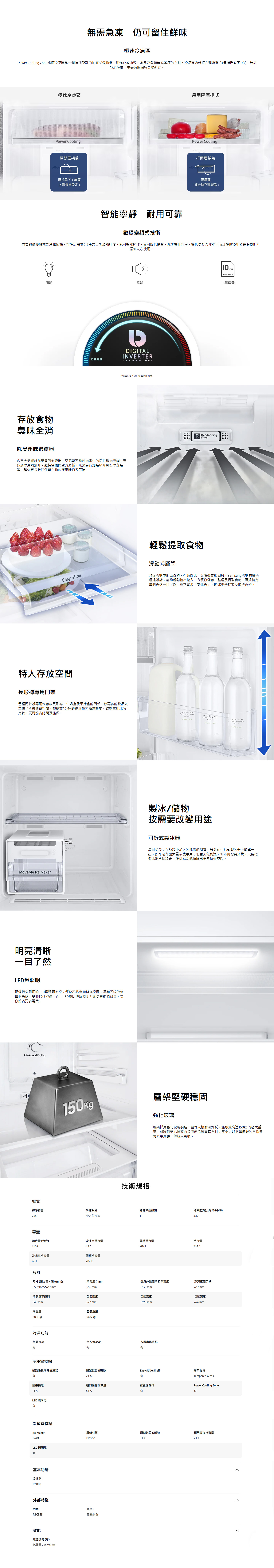 • 極速冷凍區:Power Cooling Zone極速冷凍區是一個特別設計的抽屜式儲物櫃,用作存放肉類、家禽及魚類等易變壞的食材。冷凍區內維持在理想溫度(達攝氏零下1度),無需急凍冷藏,更長時間保持食物新鮮。