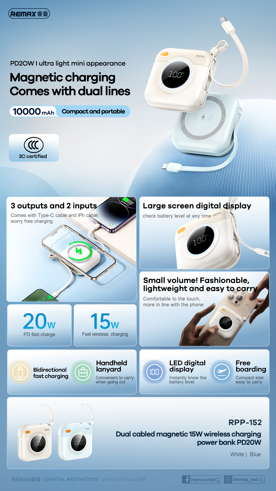 REMAX - RPP-152 磁吸15W無線充自帶線電源 | 10000mAh 磁吸magsafe無線行動電源 PD20w | 快充充電寶