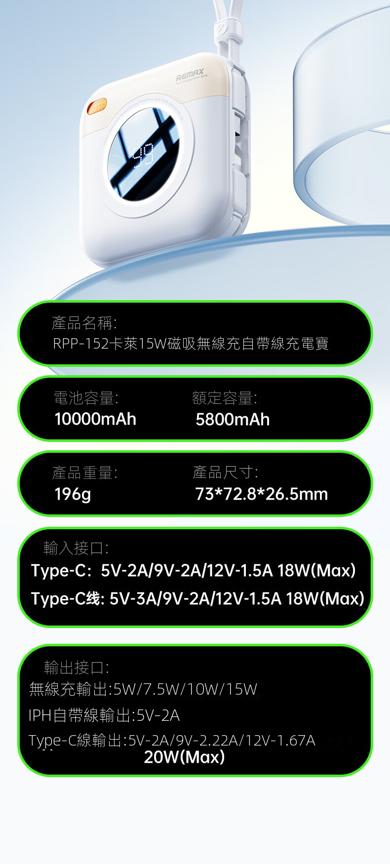 • LED數顯,電量一目了然,Type-C自帶線雙向快充,無線快充支持15W快充