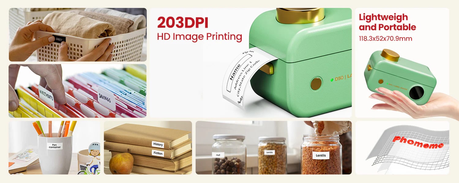 Phomemo D50是一款便利實用的大型家用標籤機。它小巧輕便,重僅184.3克,尺寸為118.3×52×70.9mm,方便攜帶使用。採用1000mAh鋰電池,續航力達1.5小時。具備180dpi高清列印,成像出色,列印效果順滑。運用熱敏無墨列印技術,操作簡單且環保。透過藍牙可與iOS、安卓手機及平板等無線連接。可列印16/20/24mm寬度標籤,相容於多種樣式。搭配專屬App,有超300個圖示、50多個範本和20種字體,支援11種語言,輕鬆滿足廚房、浴室、辦公室等多場景標籤製作需求 。