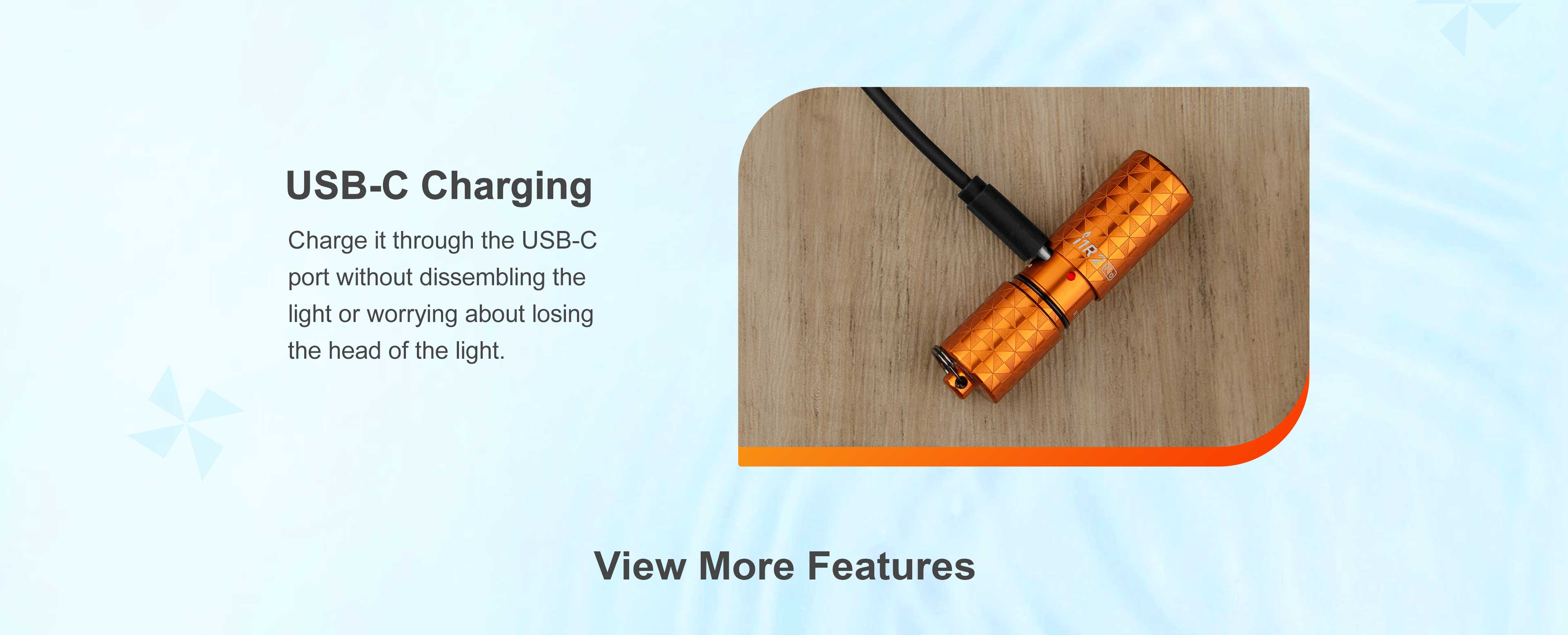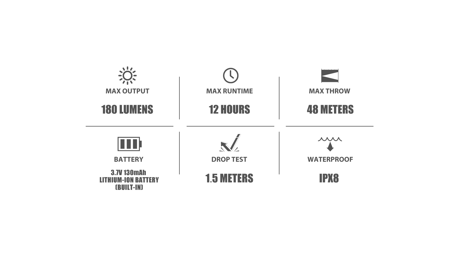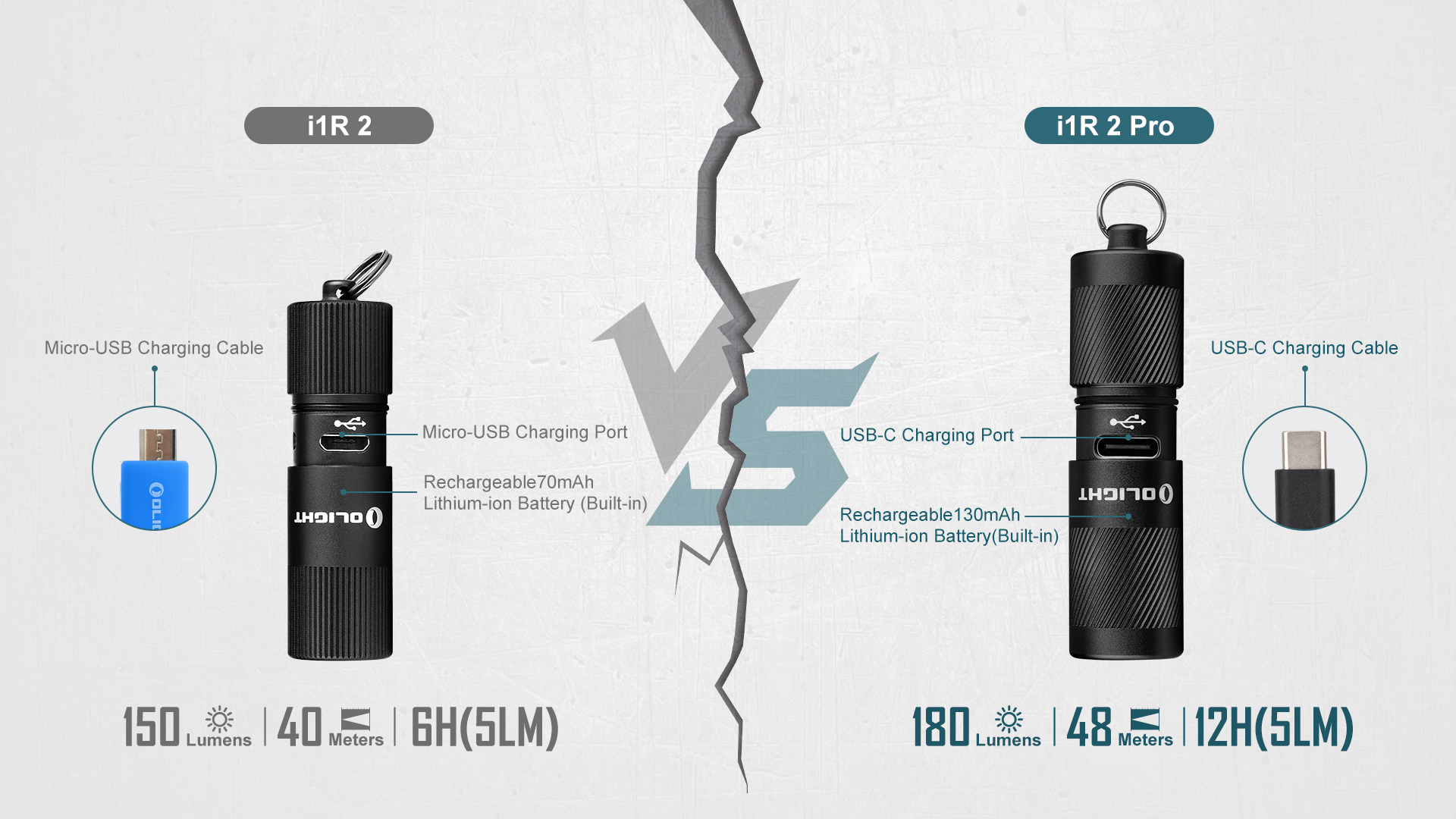 OLIGHT I1R 2 PRO袖珍型電筒,小巧便攜,筒身僅長51.3mm,直徑16.2mm,重22g ,可輕鬆掛在鑰匙圈。筒身採用鋁合金材質,耐磨防摔。內建130mAh鋰離子電池,支援Type-C充電,100分鐘內即可充滿。透過旋轉燈頭開關機並切換亮度,設有5流明和180流明兩檔,最高亮度下光線均勻柔和,最遠可投射48公尺。具備IPX8級防水與1.5公尺防摔性能,無論是日常應急,或是戶外露營、健行等場景,都能可靠地為你照亮前路。