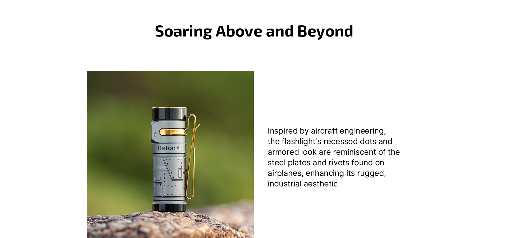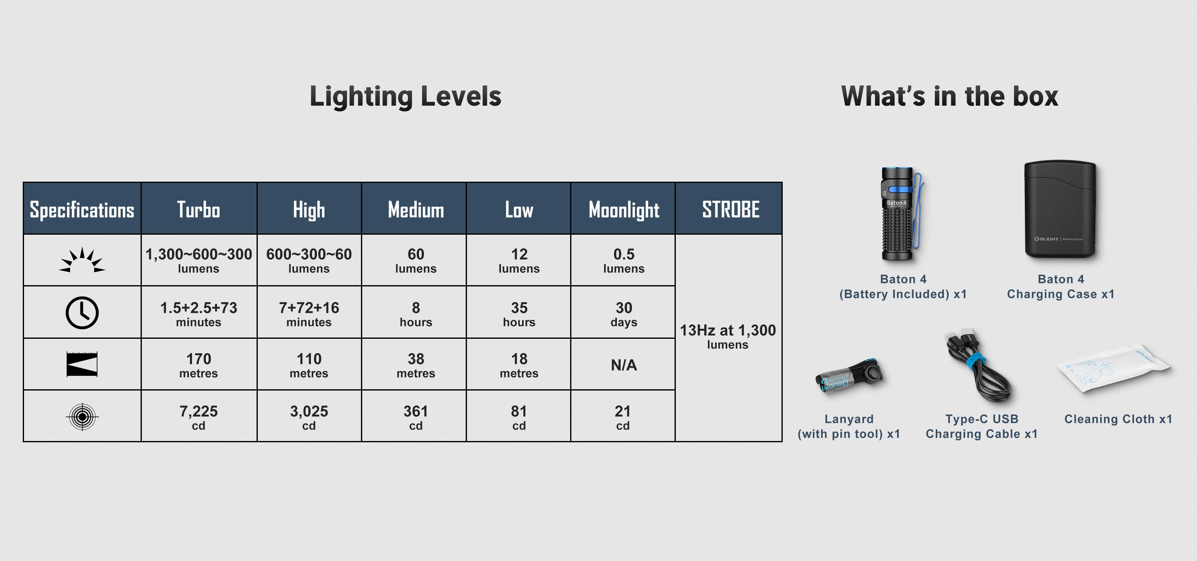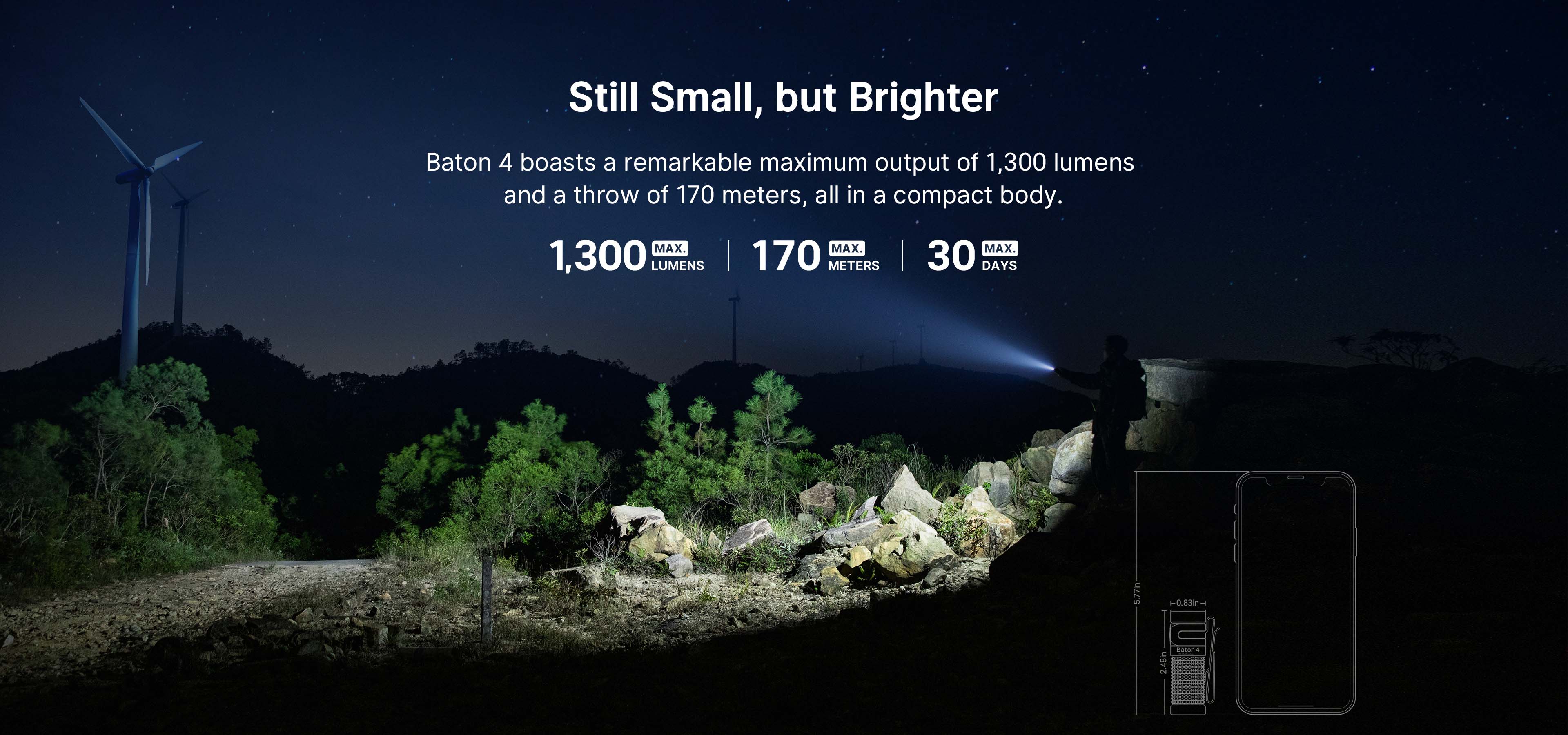 • 小巧便攜,強勁照明:Baton 4 亮度高達 1,300 流明,照射距離達 170 公尺。它小巧便攜,性能卓越,非常適合日常攜帶。