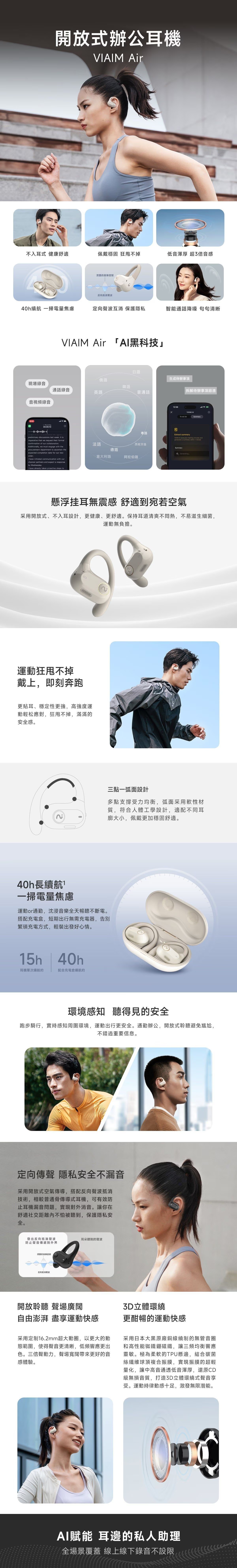 VIAIM Air智慧AI錄音開耳式真無線耳機,採用人體工學開耳設計,耳掛穩固貼合,久戴舒適不悶脹,適合運動等高強度活動。其搭載先進動態驅動單元與定向聲波技術,音質出色,低音深沉、音頻清晰,且能保障隱私。內建viaim Ai大模型,支援32種語言即時錄製,捏住感應區即可開啟。具備智能降噪,通話清晰。擁有長達40小時續航,無畏電量焦慮。開放雙耳設計,讓你在運動等場景中也能留意周圍環境,安全又方便。