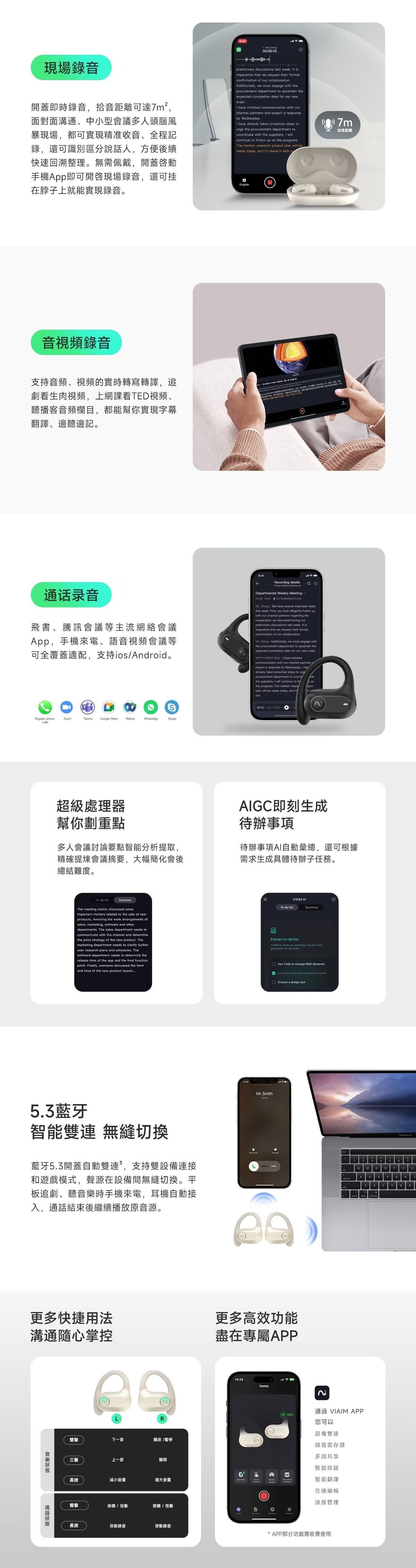 • AI 錄音強:內建 viaim Ai 大模型,支援 32 種語言即時錄音轉寫,捏住感應區即可快速開啟,會議記錄、訪談錄音更有效率。