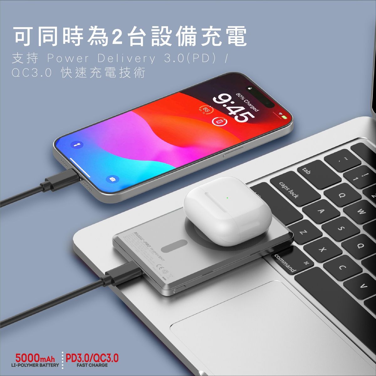 • 磁吸設計,超薄無線快充流動電池