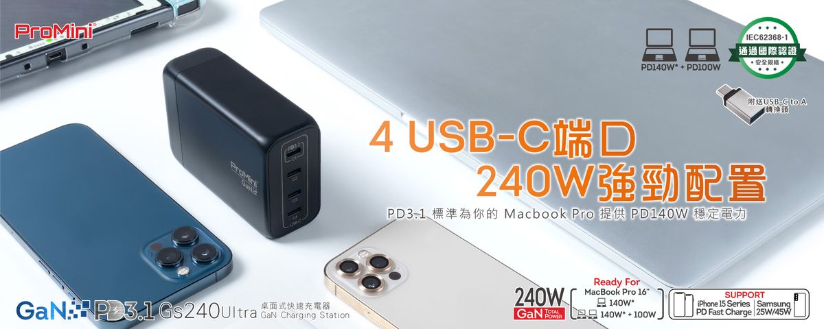 Outlet Express HK 生活百貨城在香港觀塘提供 ProMini Gs240 Ultra 4x USB-C PD3.1 GaN 240W快速充電器 | 四組快充輸出 | 通過IEC62368-1國際認證 | 香港行貨 在那裡買邊到買或邊度買代理資料及價錢實惠借批發優惠以及公司學校報價,更可送到香港或澳門而部份產品比團購更優惠,更可以為你推薦推介相似產品及優點缺點,請留意我們最新產品價格更新。