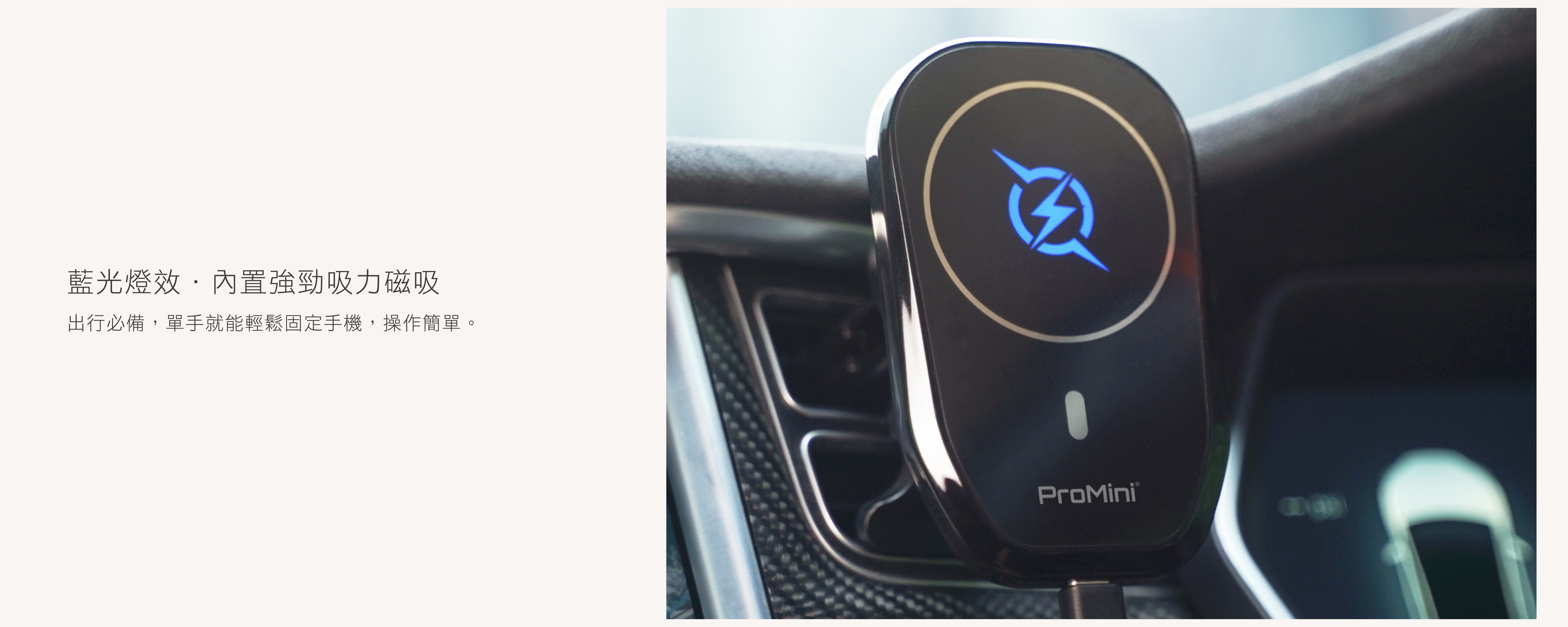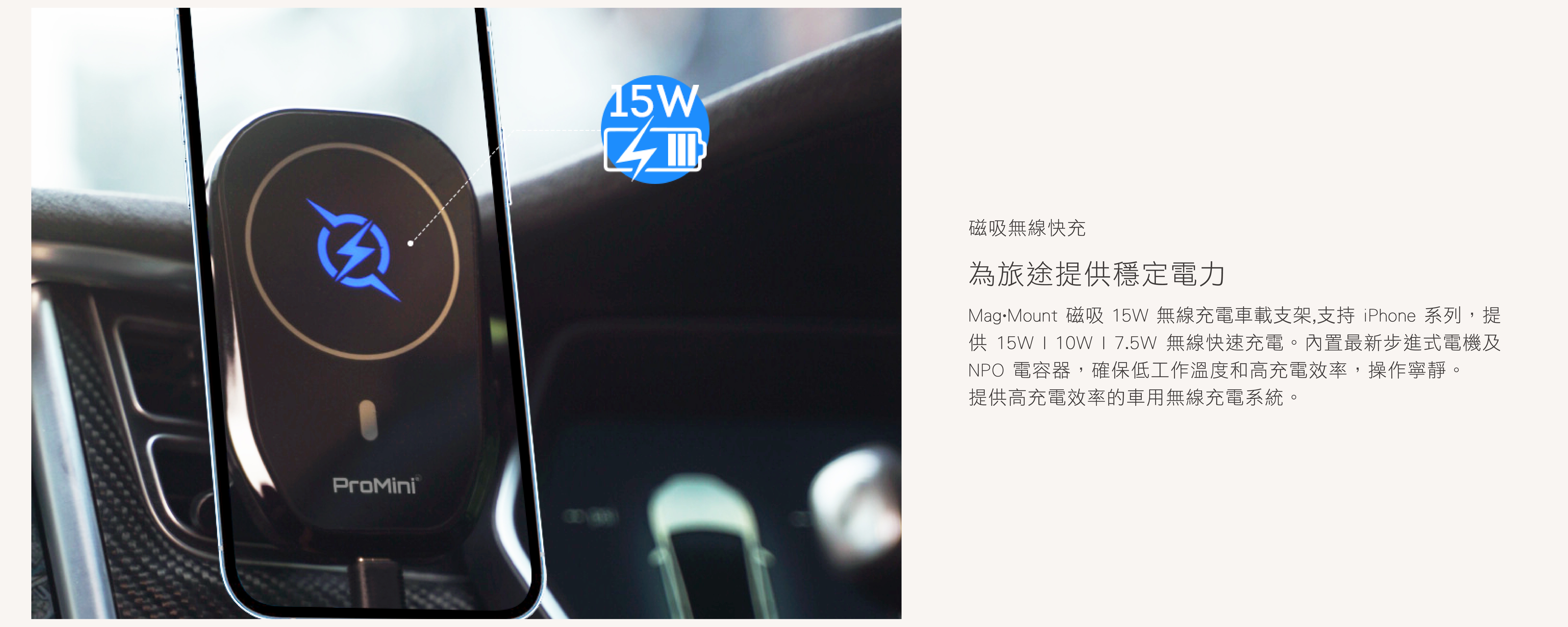 ProMini Mag·Mount磁吸無線快速充電車架快充,專為iPhone系列打造。它內建超強磁鐵,充電時伴隨酷炫燈光。支援15W/10W/7.5W快速無線充電,適用於iPhone 16/15/14/13/12等具備磁吸無線充電功能的機型,也相容於Magsafe磁吸保護殼。左右兩側設有LED指示燈,能清楚了解充電狀態。採用NPO電容,低溫環境也有高充電效率。 360度可旋轉的空調出風口夾,滿足你不同角度的觀賞需求,讓駕駛途中使用手機更便利、更有效率。