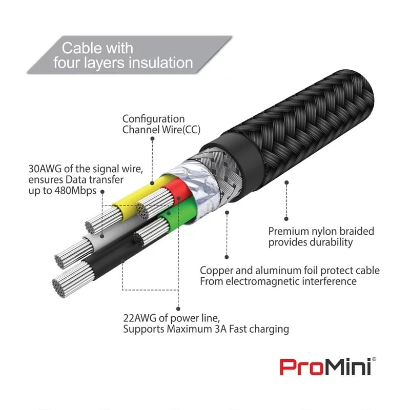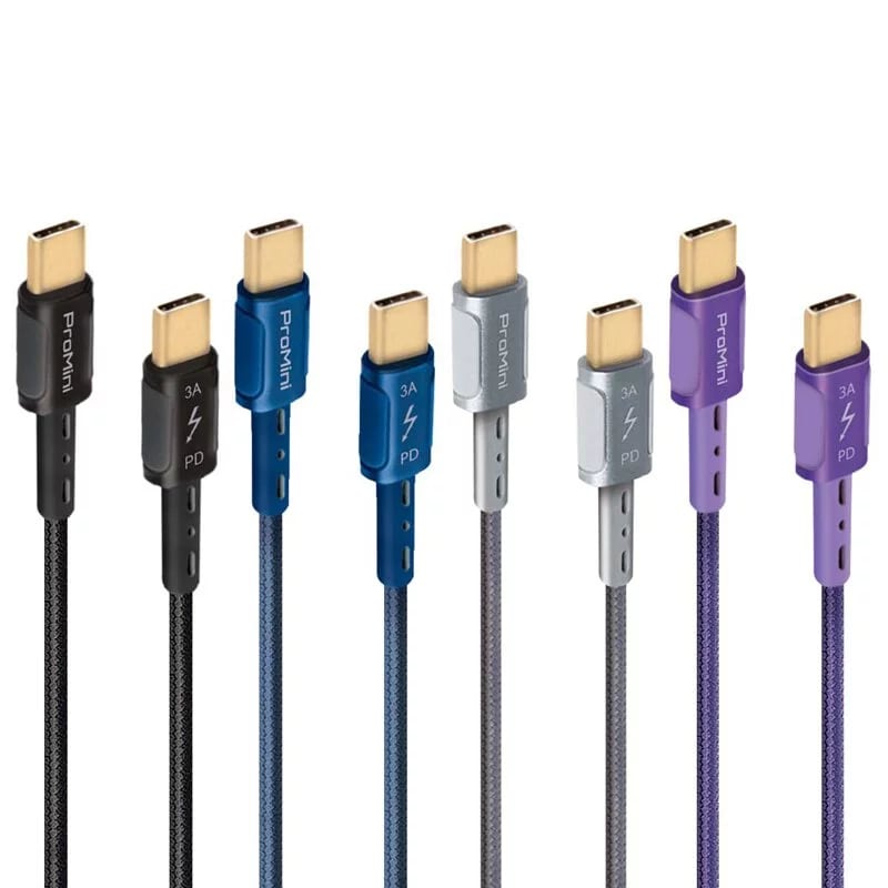 ProMini Type-C to Type-C PD Quick Charge & Sync Cable是一款高品質配件。它外層為耐用的尼龍編織材質,接頭則鍍有 24K 金,確保連接穩定。內部採用 22AWG 充電線芯(200 厘米長度款升級為 21AWG),並搭配鍍錫 4N 99.99% 高純度無氧銅,具備抗氧化技術,增強了線材強度與耐用性。這款傳輸線支援 20V/3A PD 快速充電,最高可達 60W,同時兼容 QC 3.0/2.0 快充協議。數據傳輸速度可達 480Mbps,能快速傳輸資料,抗干擾雙屏蔽設計確保數據傳輸穩定。採用環保材料製成,安全可靠。