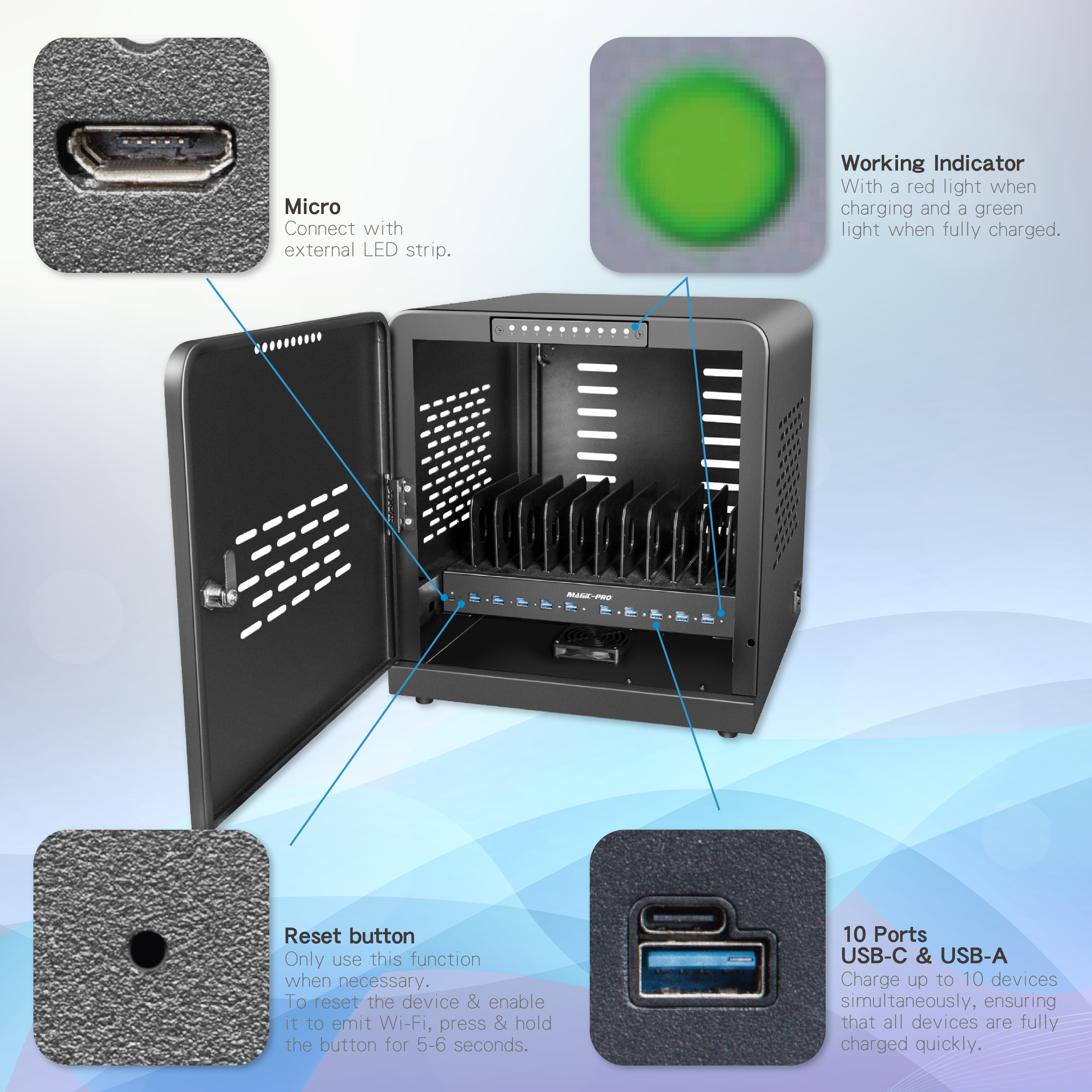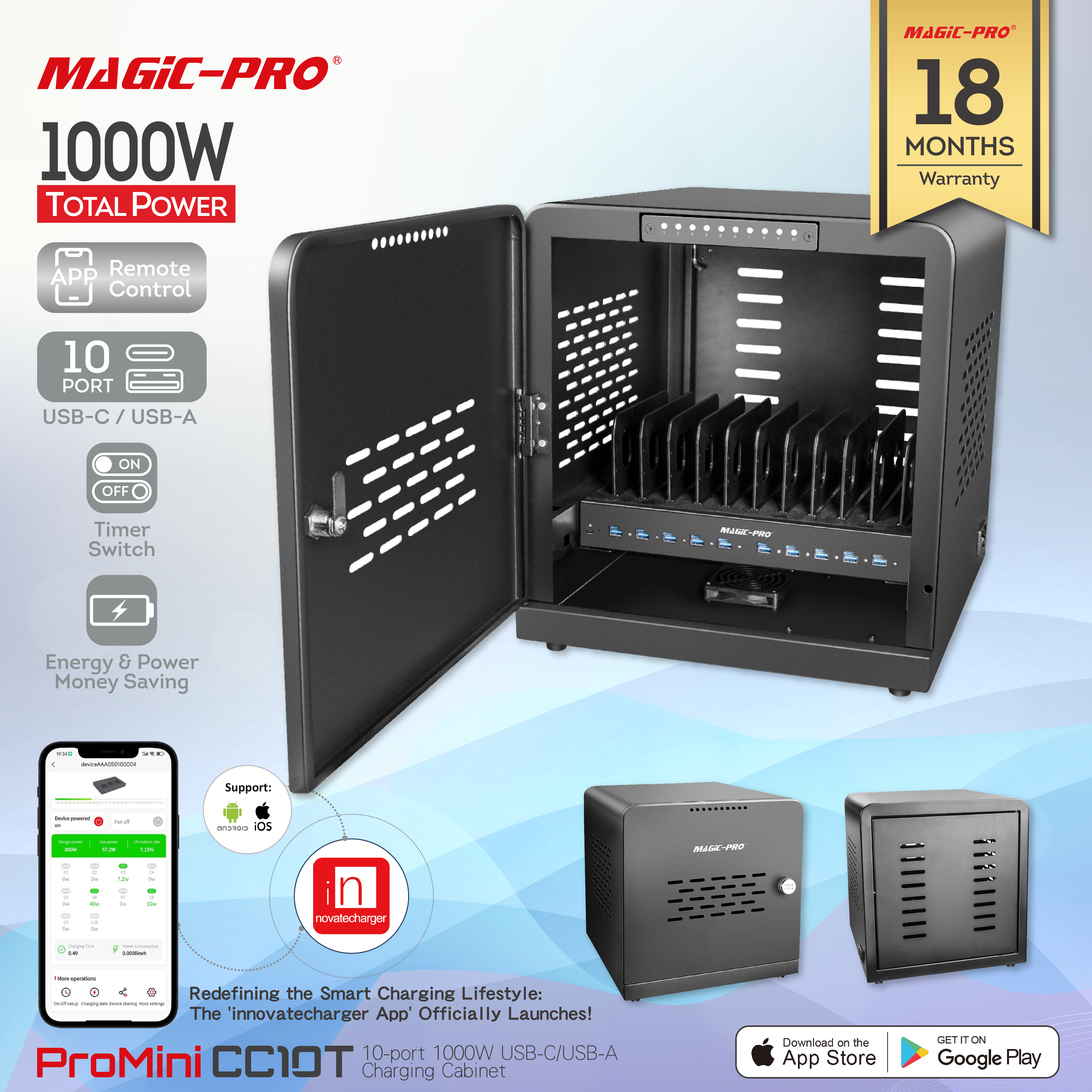 ProMini CC10T 1000W 10口(USB-C/USB-A)充電櫃,是一款功能強大且實用的充電設備。它擁有1000W的大功率,能高效為各類設備充電。配備10個端口,包含USB - C與USB - A接口,可相容於多種電子設備。支援多種快充協議,如PD3.0、QC3.0等,大幅縮短充電時間。充電櫃每一層板的充電介面與指示燈排列整齊,能清楚顯示設備充電狀態,紅燈代表充電中,綠燈代表已充滿或未連接。其設計貼心,可防止充電線糾纏,保障安全,是公共區域、辦公室等的理想充電解決方案。