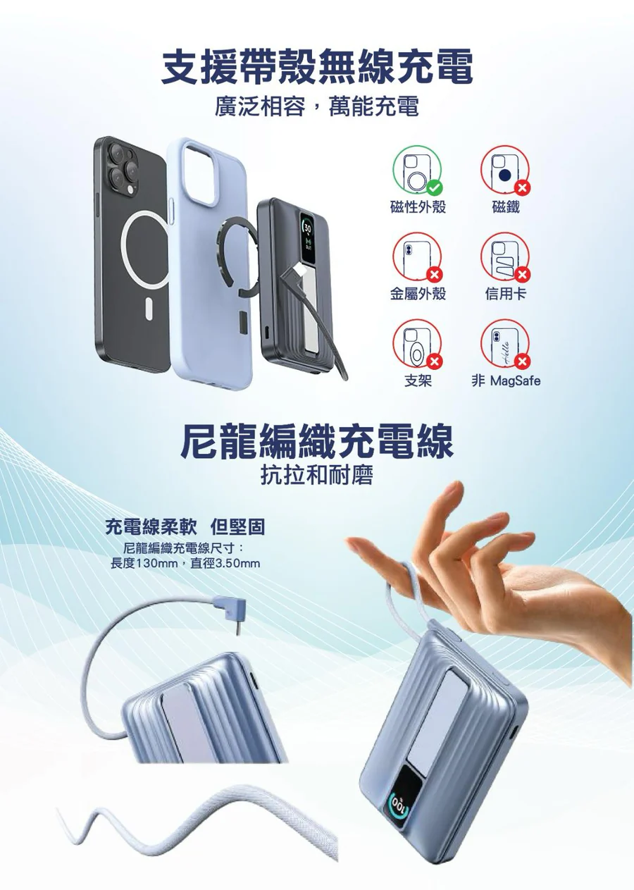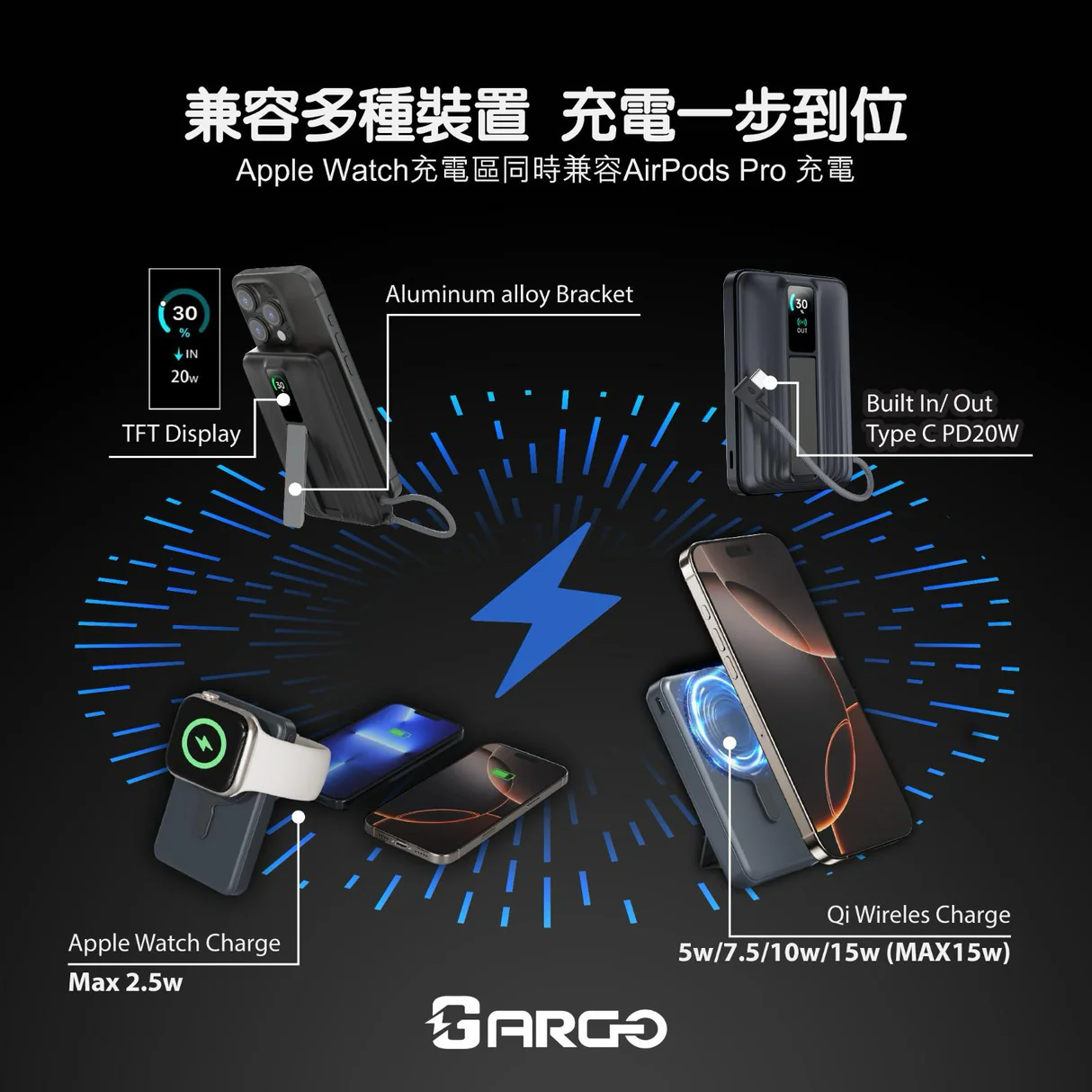 ARGO MD10 PLUS 10000mAh 5 合 1 磁吸快充行動電源,是商務旅行與日常生活的理想伴侶。它具備 15W 磁吸無線快充與 20W PD 自帶線快充,支援磁吸、自帶線、介面三模充電,真正實現 All in One,告別線材糾纏。配備 TFT 高清數顯,可即時監控電量及輸入輸出功率,充電狀態一目了然;還配有一體式鋁合金支架,方便邊充邊刷劇,解放雙手。內建航空級鋰聚合物電芯,提供過充、過流、短路、過熱、過放五重安全防護,確保使用安全。