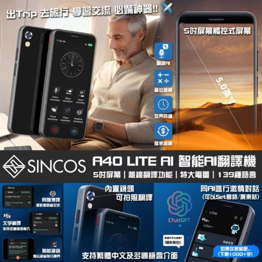 SINCOS A40 Lite AI 智慧翻譯機是旅行高峰期必備單品,搭載 5 吋觸控式螢幕,操作方便。它支援線上 139 種語言翻譯(含廣東話翻譯),也具備 17 種離線翻譯語言同聲傳譯功能,輕鬆跨越語言障礙,開啟全球交流新紀元。此翻譯機內建鏡頭,可實現 75 種語言拍照即時轉譯,同時配備匯率換算 app,滿足出行中的實用需求。其搭載 1500mah 鋰電池,續航力約 7 小時,能應付日常使用。