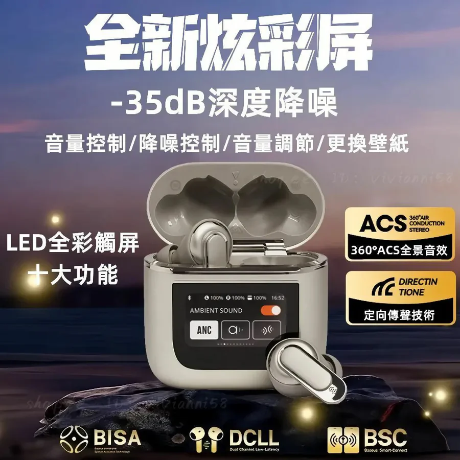 • 配備 LED 全彩輕觸式螢幕充電盒,支援觸控螢幕操作,可調整音量、控制降噪模式,還能自訂更換壁紙,兼顧操作便利與視覺個人化。