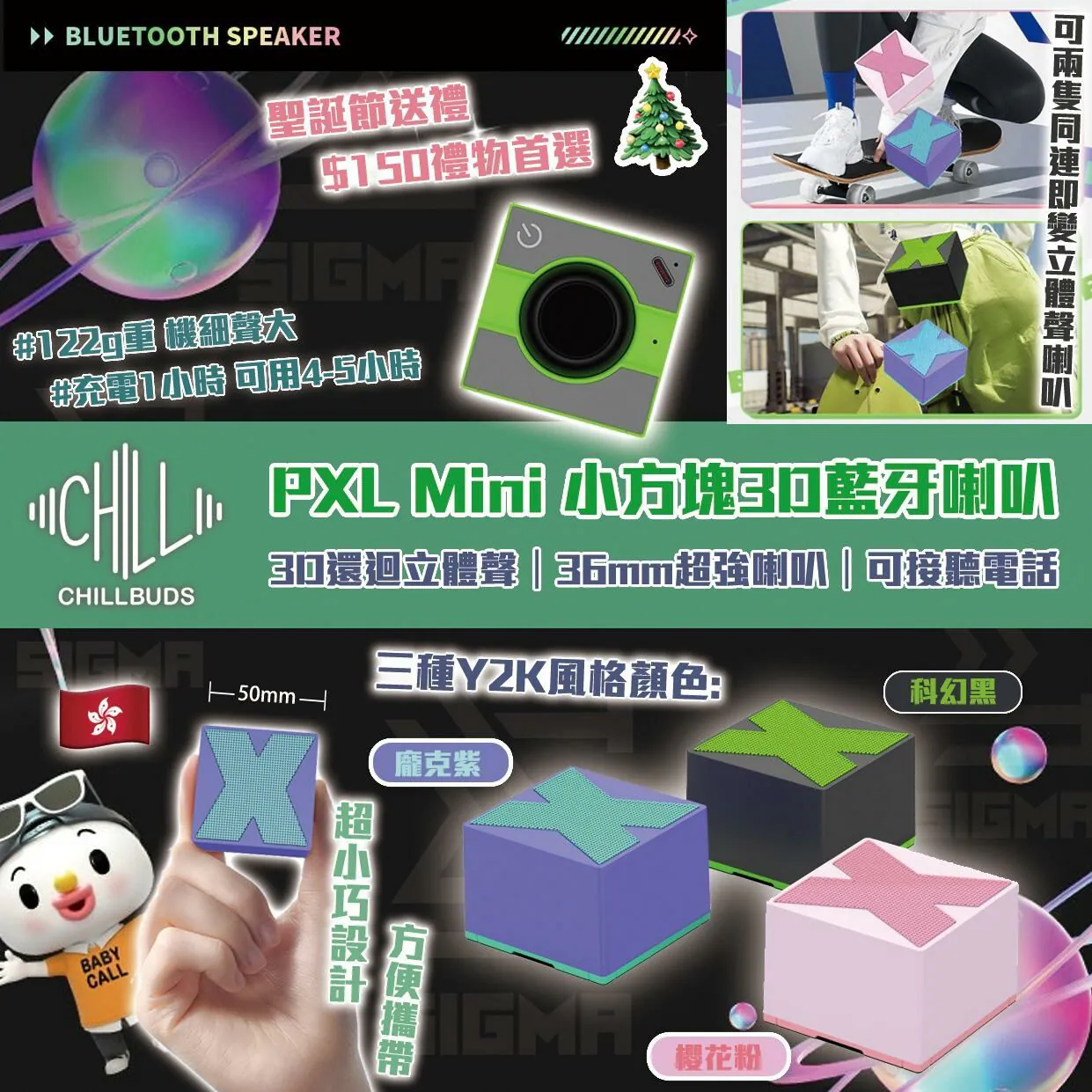 作為香港品牌出品的CHILLBUDS PXL MINI小方塊3D藍牙喇叭,是送禮與日常使用的優質選擇。它採用Y2K風格設計,擁有科幻黑、龐克紫、櫻花粉三種潮流配色,機身僅5.5cm×5.3cm×2.2cm,重122g,輕便小巧方便攜帶。音質上,其具備3D環回立體聲與36mm強勁喇叭,還支援兩隻同連變身立體聲喇叭,音效更出色。它搭載藍牙5.0技術,連接穩定,支援高清免持通話;採用TYPE-C接口,充電1小時可使用4-5小時。