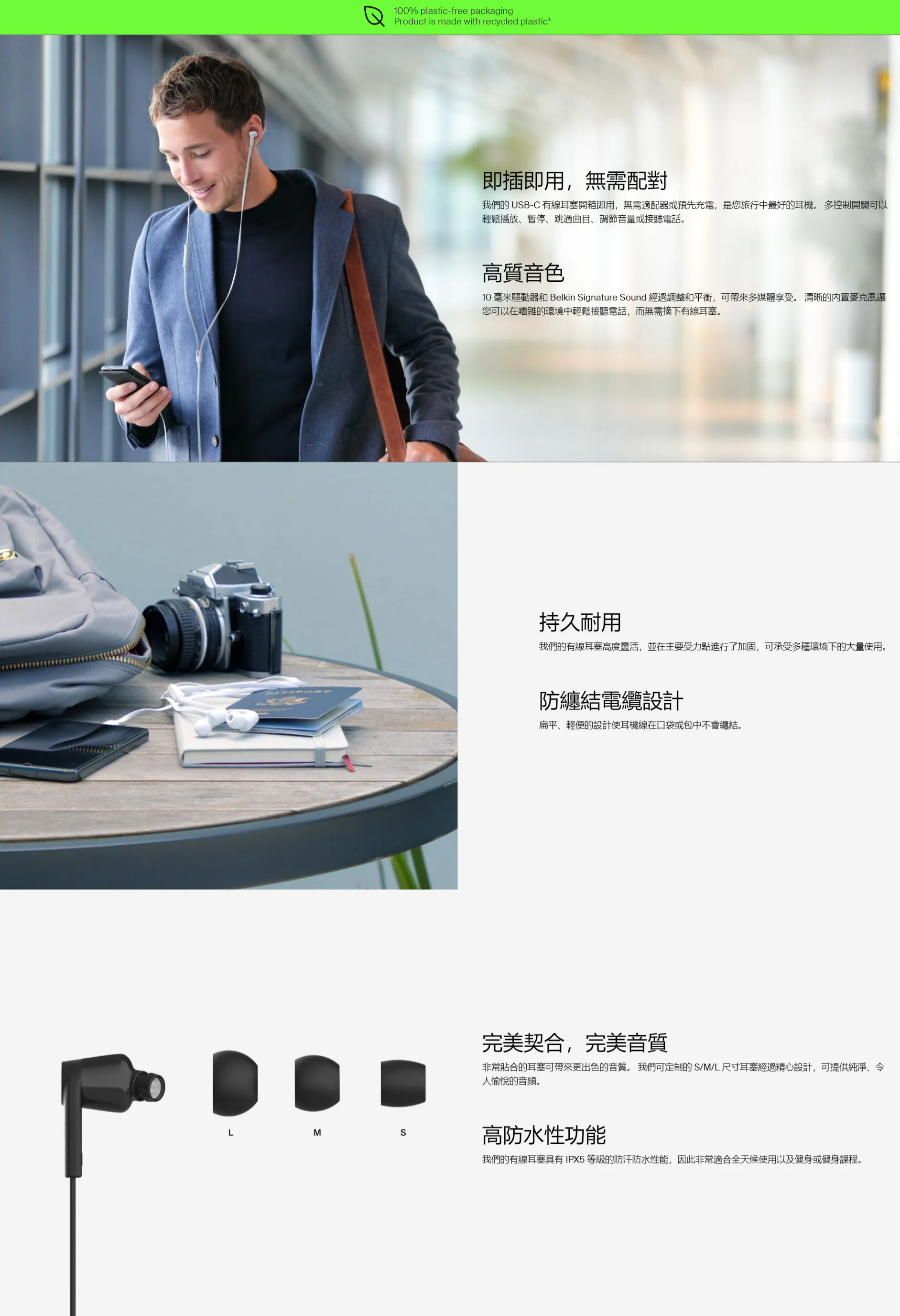 Belkin ROCKSTAR™ 入耳式耳機(TYPE-C 插頭),以實用設計與出色效能滿足多元需求。它即插即用,無需轉接器和預先充電,多控制開關可輕鬆操作播放、暫停、跳曲、調整音量及接打電話,旅行使用方便。搭載 10 毫米驅動單元與 Belkin Signature Sound,音質經調校平衡,帶來沉浸式高保真音頻,內置麥克風還能在嘈雜環境中保證清晰通話。耳機高度靈活且主要受力點加固,耐用性強,搭配 1.2 公尺防纏結扁平電纜,收納不雜亂。配備 S/M/L 三尺寸耳塞,貼合耳部且能隔離噪音,全天佩戴舒適;IPX5 級防汗防水設計,適配全天候使用及健身場景。