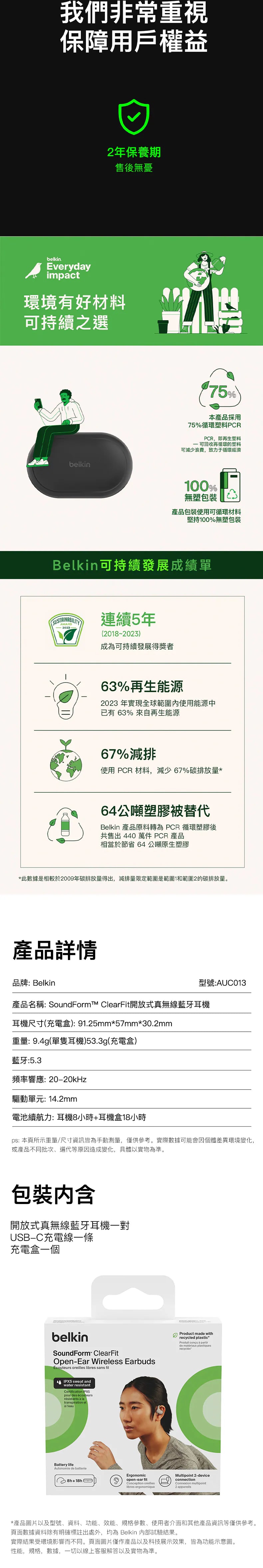 Belkin SoundForm ClearFit 開放式無線耳機,採用開放式空氣傳導設計,無需塞入耳朵,搭配人體工學構造與膚感矽膠掛耳,舒適貼耳且無感佩戴,告別雙耳負壓,長戴無負擔,尤其適合運動、戶外及健身場景,能在享受音質時感知周圍環境。耳機搭載 14.2mm 低音單體與貝爾金金標音質調校,還原音樂現場感,還具備 IPX5 防汗防水等級,應對運動出汗或輕度濺水無壓力。單次播放續航 8 小時,搭配充電盒總續航 26 小時,支援 USB-C 快充,充電 10 分鐘可播放 90 分鐘;藍牙 5.3 技術讓10米內連接穩定,支援多點聯機實現兩部設備音訊切換,雙 ENC 麥克風還能消除環境噪音,保障清晰通話。產品採用 75% 循環塑膠 PCR 製作,兼顧環保概念。