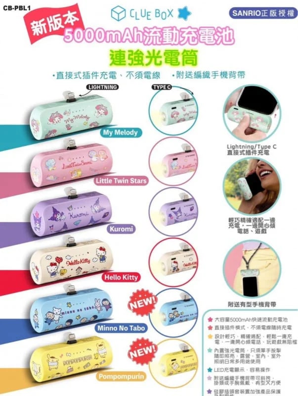 ClueBox x Sanrio CB-PBL1 5000mAh 行動電源獲 SANRIO 正版授權,涵蓋 My Melody、POMPOMPURIN、KEROKEROKEROPPI 等多款經典 Sanrio 角色樣式,滿足不同喜好選擇。內建 5000mAh 大容量 Li-ion 電池,支援 Lightning/Type C 直接式外掛充電,無需額外電線,可邊充電邊暢快通話、玩遊戲,無遮蔽幹擾。機身還內建強光電筒,單手按掣即可點亮,適配露營、室內緊急、室外照明等多種日常場景。產品設計輕巧便攜,搭配 LED 充電顯示功能,充電狀態清晰可見,操作簡單易懂。指定款式附贈編織手機背帶,支援斜背、掛頸或手腕配戴,兼具實用性與時尚感,且廣泛相容於 iPhone 和 Android 裝置。