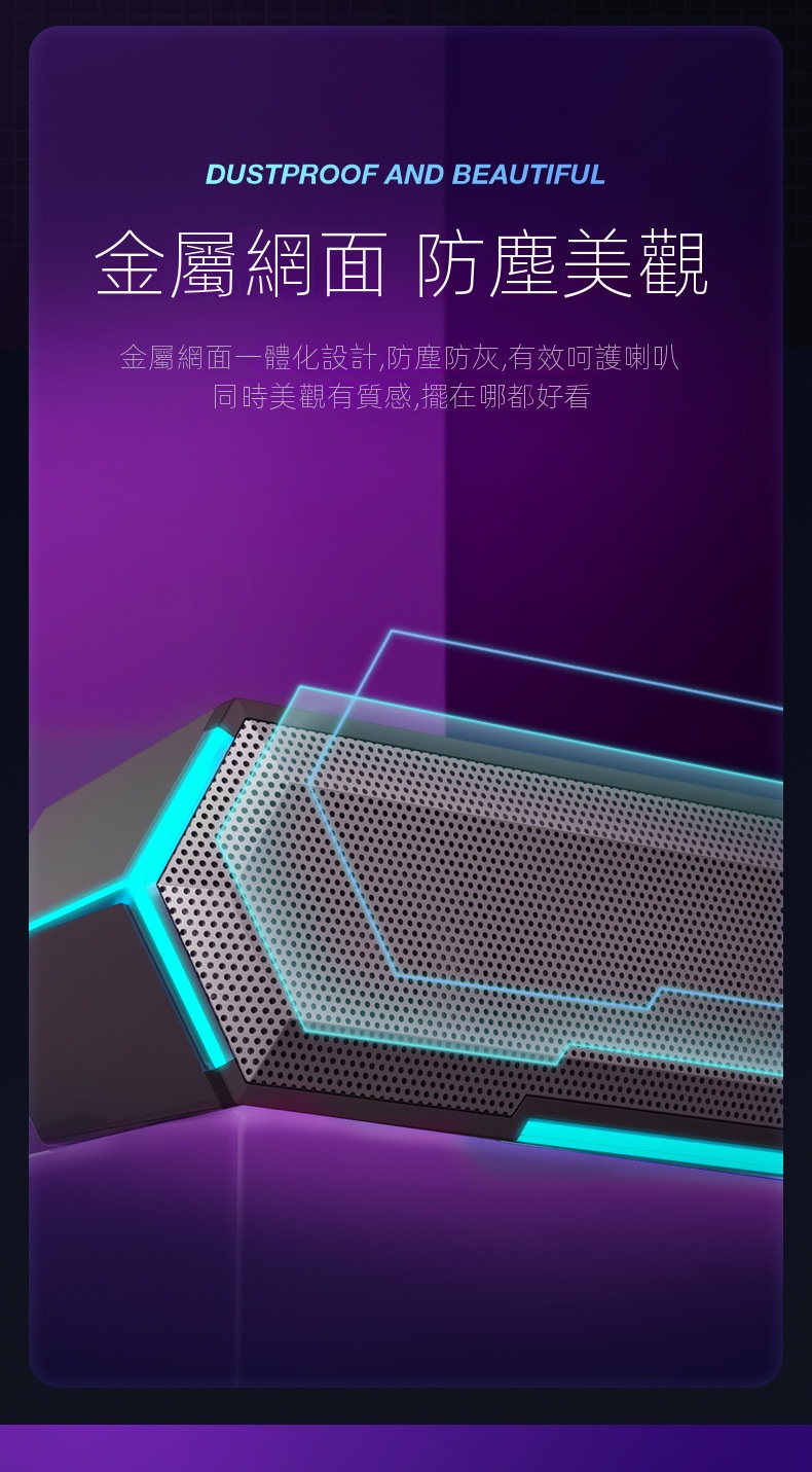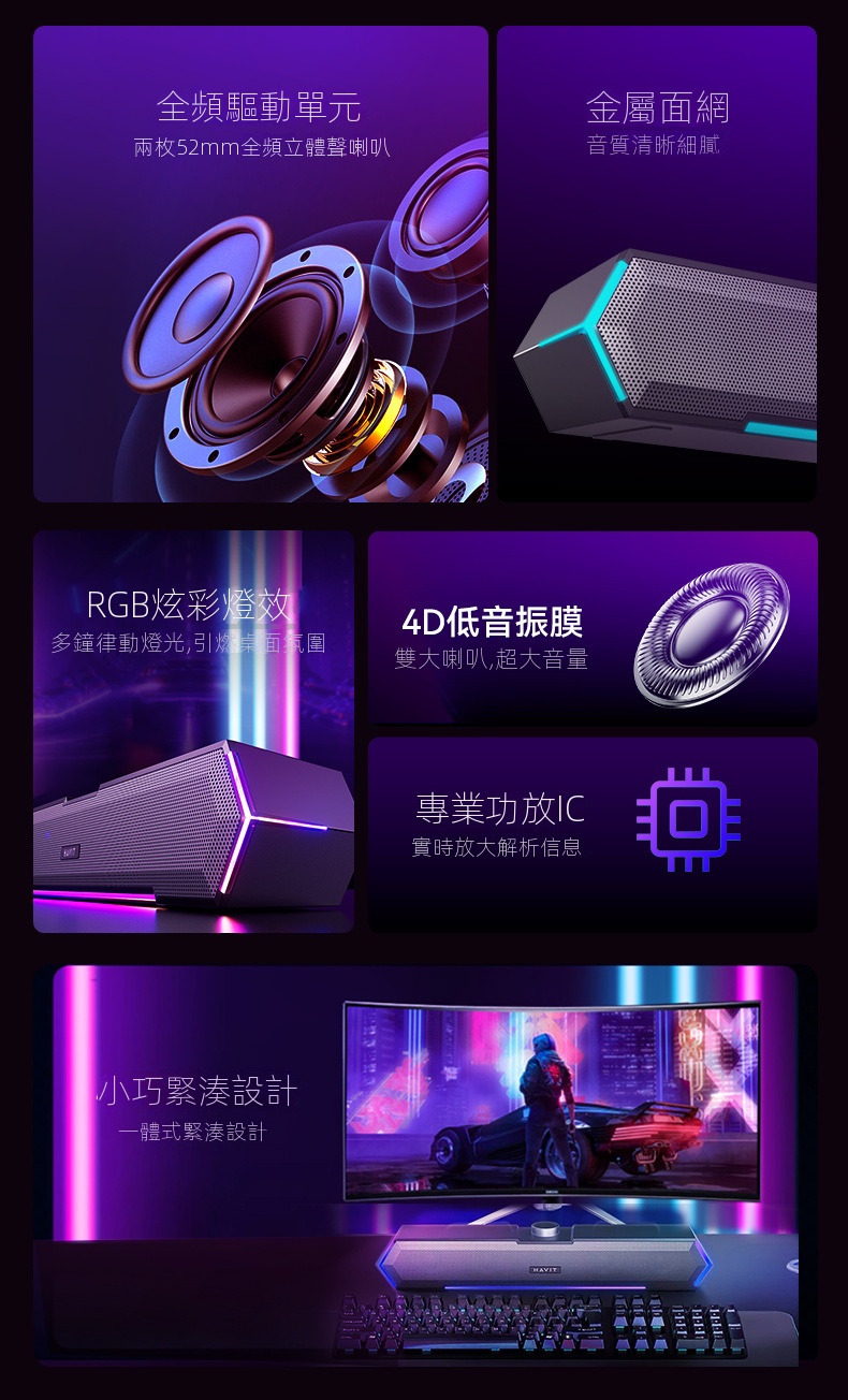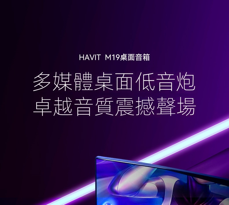 Havit海威特M19有線藍牙音箱,擁炫彩RGB燈效,營造酷炫氛圍。超廣頻響範圍與360°環繞音效,提供沉浸式聽覺體驗。配備全頻驅動單元與4D低音振膜,音質清晰震撼。小巧設計,易於擺放,獨立音量旋鈕操作簡便。支援多種設備連接,無論遊戲、電影或音樂,皆能展現卓越音效。是提升桌面娛樂品質的理想選擇。
