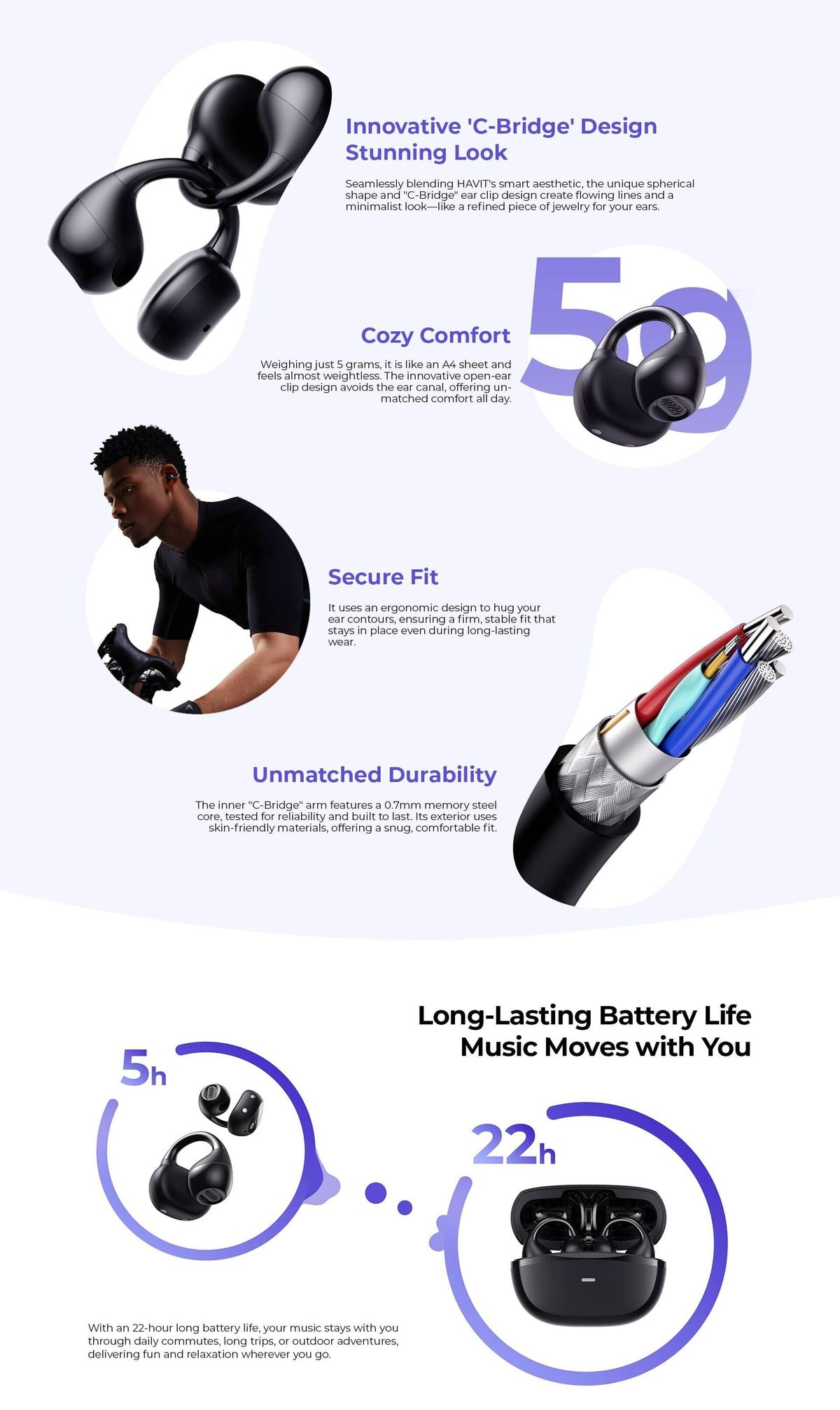 HAVIT OWS916 無線骨傳導耳機為香港行貨,搭載最新藍牙 6.0 技術,無線連接穩定,10 公尺無障礙傳輸範圍滿足日常需求。創新開放式夾耳設計搭配 “C-Bridge” 結構,內建 0.7mm 記憶鋼芯,僅 4.9 克的輕量化機身貼合耳廓,久戴無負擔且佩戴穩固。耳機支援 IPX5 防水,應對日常出汗、小雨無憂,12mm 喇叭單元覆蓋 20Hz~20KHz 頻率,配合雙 MIC ENC 降噪,通話清晰。 40mAh 耳機電量可連續播放 5 小時,搭配 400mAh 充電盒總續航力達 22.5 小時,Type-C 介面 2 小時即可充滿。支援 A2DP/HFP 等多種設定檔與 AAC/SBC 編碼,可透過 HAVIT LIFE APP 調整 EQ 和遊戲模式,還能同時配對兩部手機。