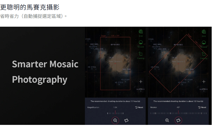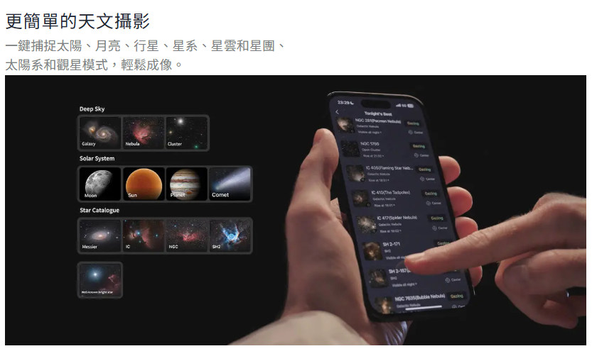 • 智慧自動化操作:支援 APP 自動尋星、追蹤與拍攝,一鍵捕捉太陽、月球、行星、星係等目標,還可開啟赤道模式(需搭配 TH10 底座)達到穩定長曝光。