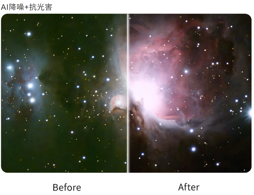 • 抗光污染設計:內建暗場濾鏡、UV/IR Cut 濾鏡及天文光害濾鏡(優化 OIII 與 Ha 波長),結合 AI 降噪,在城市光害區域也能拍攝純星空。