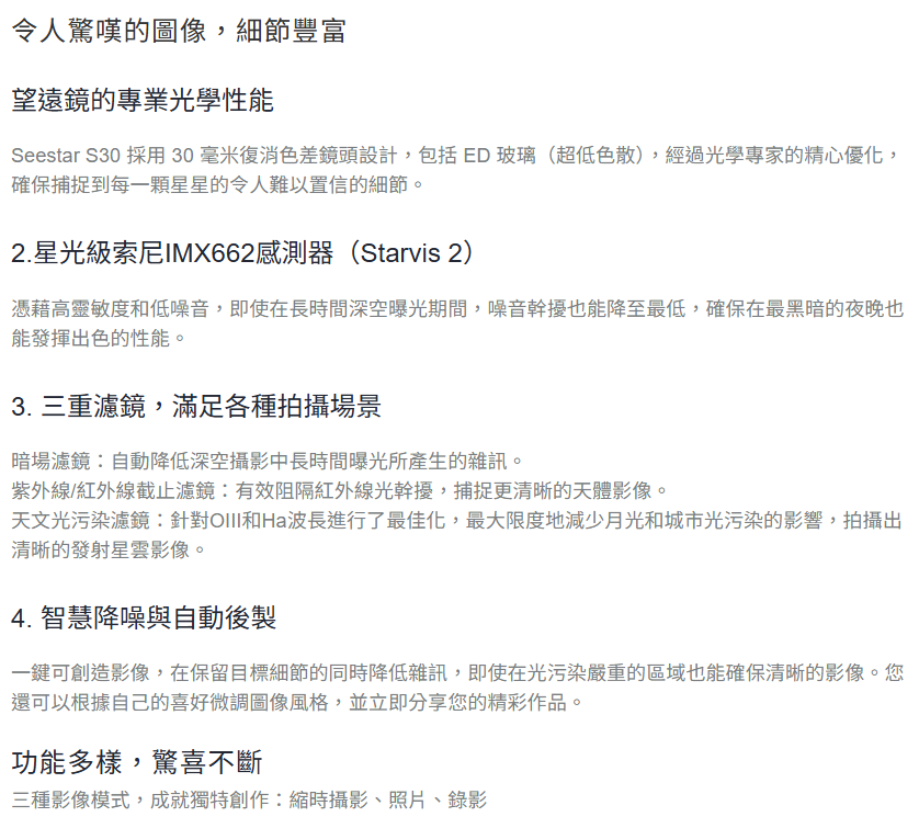 • 雙鏡頭專業配置:具備長焦與廣角雙鏡頭,可即時切換視角,搭配 30mm 復消色差鏡頭(含 ED 玻璃),兼顧星空特寫與全景捕捉,成像細節清晰。