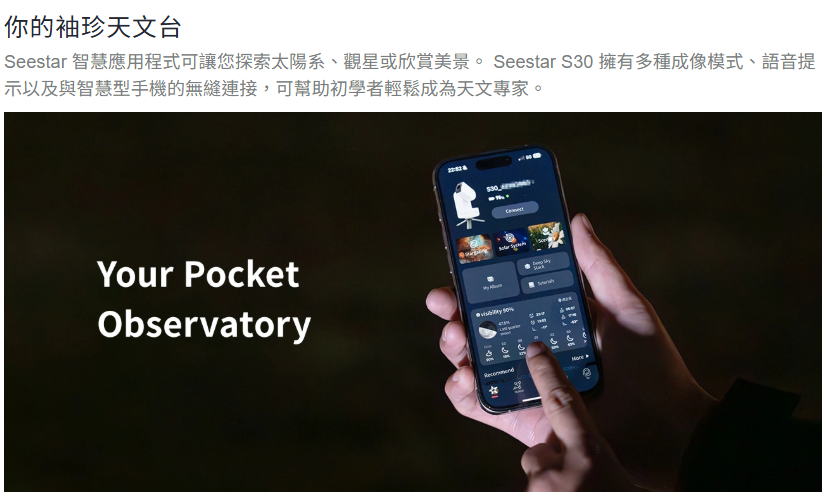 Outlet Express HK 生活百貨城在香港觀塘提供 ZWO Seestar S30 智慧天文望遠鏡 | Sony IMX662 感光元件 | 雙鏡頭一鍵切換 | 磁吸太陽減光濾鏡 在那裡買邊到買或邊度買代理資料及價錢實惠借批發優惠以及公司學校報價,更可送到香港或澳門而部份產品比團購更優惠,更可以為你推薦推介相似產品及優點缺點,請留意我們最新產品價格更新。