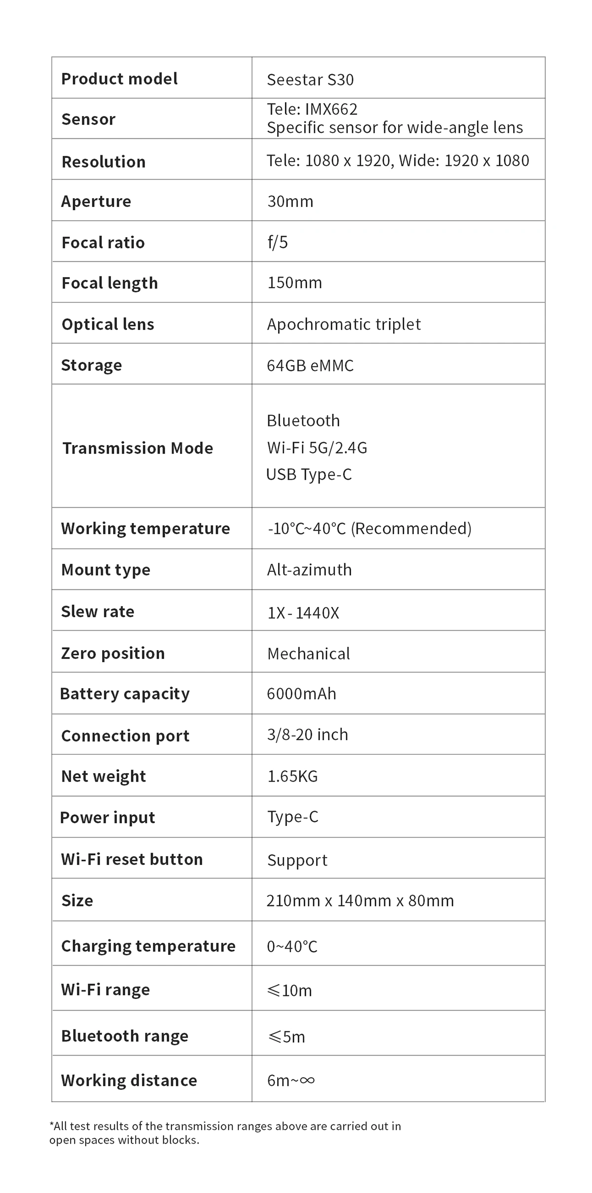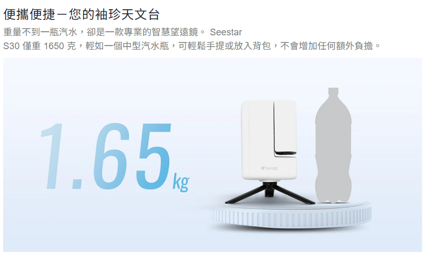 ZWO Seestar S30是集多功能與便攜性於一體的智慧天文望遠鏡,重量僅1.65Kg,尺寸140X80X209.5mm,輕鬆收納於背包,外出攜帶與架設極為便捷。採用雙鏡頭設計,30mm長焦鏡頭等效焦距1005mm,搭配約4mm廣角鏡頭(105mm等效焦距),可一鍵切換廣角尋星與長焦特寫,點選目標即可啟動自動追蹤。內建6000mAh電池續航力約6小時,支援Type-C外接供電,64G記憶體滿足儲存需求。配備UV/IR Cut、Ha/Oiii等濾鏡,新增智慧降噪功能,搭配馬賽克拼圖模式,2.6平方度長焦視野可捕捉廣闊星空。透過手機APP實現自動定位、對焦與拍攝控制,天地雙用,是天文入門與戶外觀測的優選。
