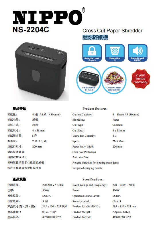 Buy NIPPO NS-2204C 8L座枱式迷你碎紙機 - 黑色 | 每次碎4張紙 | 過熱保護 | 自動啟動或停止 | 香港行貨 | 兩年保養 price in outletexpress .com Hong Kong.In promotion and sale.