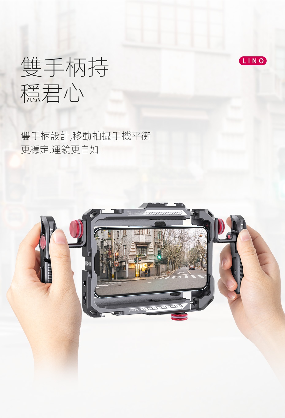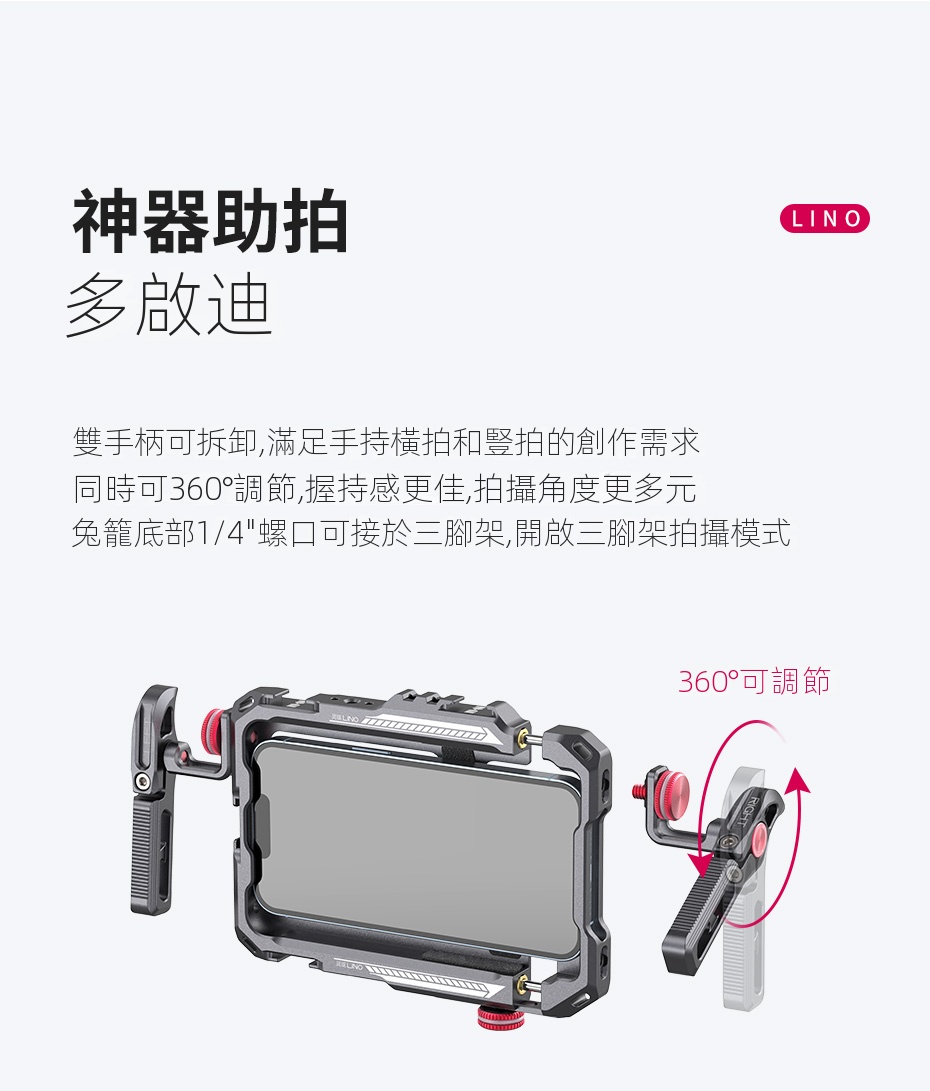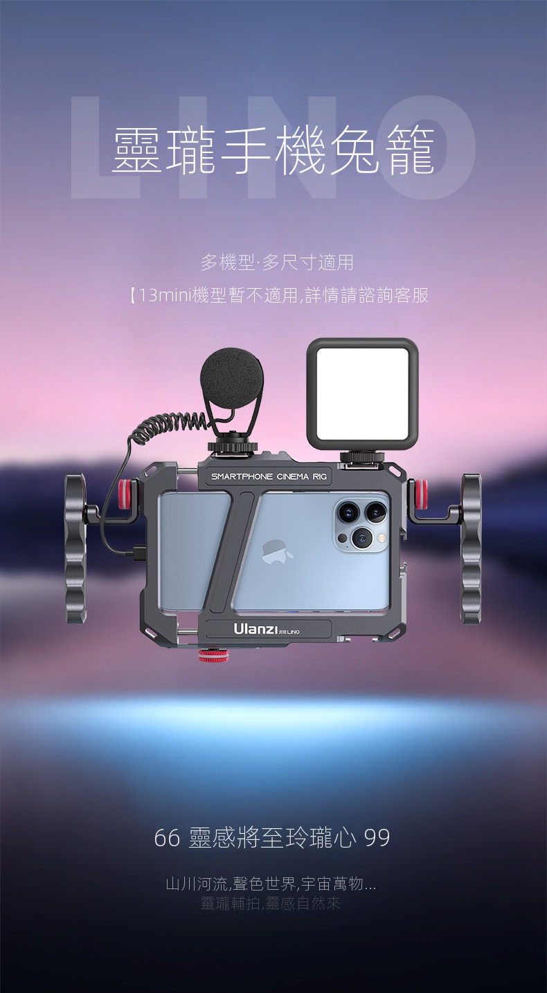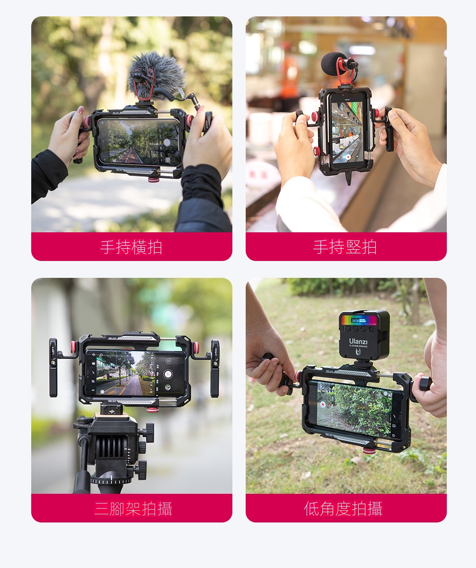 靈瓏手機兔籠是一款專為手機拍攝設計的多功能輔助裝置,適用於多種型號和尺寸的手機(不包括iOS 13 mini)。產品採用高強度鋁合金材質,重量僅245克,輕便易攜。雙手柄設計提供穩定握持,適合手持橫拍、豎拍及三腳架固定等多種拍攝方式,並可360°調節角度,滿足不同創作需求。 靈珑手機兔籠配備標準的1/4"螺口、冷靴接口及阿萊定位監視器接口,兼容多種配件,擴展性強。內置多處墊片,確保手機穩固不滑落;四角設有掛繩孔位,防止脫落,保護設備安全。卡扣式拉伸設計,適應137mm至165mm範圍內的iOS和安卓手機,適用性廣泛。 產品採用CNC高精度加工工藝,結構精巧緊湊,結實耐用。底部旋鈕可鎖止伸縮卡口,確保拍攝時更加安心穩定。靈瓏手機兔籠不僅提升手機拍攝體驗,還為創作者帶來靈感與便利,是專業與愛好者理想的拍攝輔助工具。