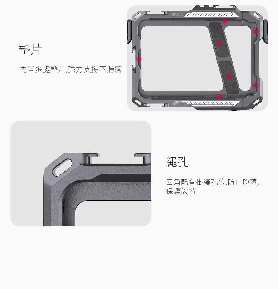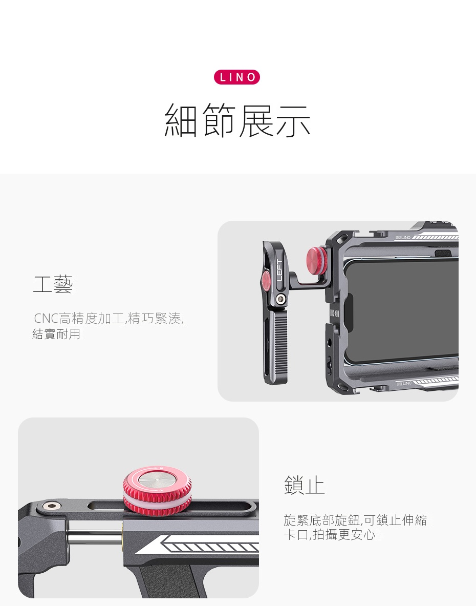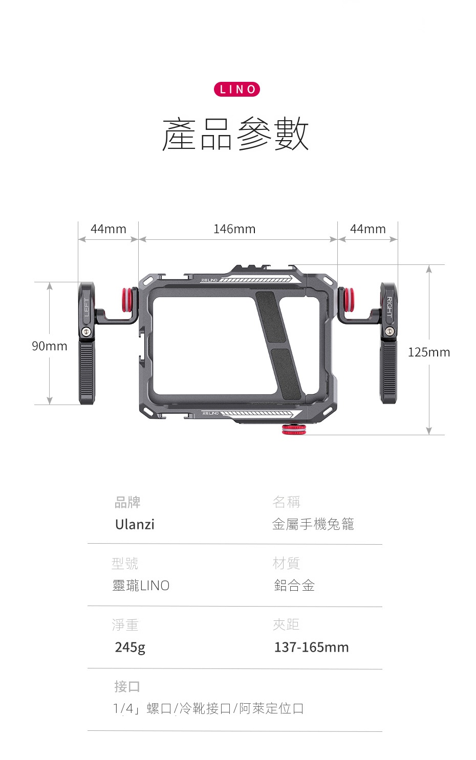 靈瓏手機兔籠是一款專為手機拍攝設計的多功能輔助裝置,適用於多種型號和尺寸的手機(不包括iOS 13 mini)。產品採用高強度鋁合金材質,重量僅245克,輕便易攜。雙手柄設計提供穩定握持,適合手持橫拍、豎拍及三腳架固定等多種拍攝方式,並可360°調節角度,滿足不同創作需求。 靈珑手機兔籠配備標準的1/4"螺口、冷靴接口及阿萊定位監視器接口,兼容多種配件,擴展性強。內置多處墊片,確保手機穩固不滑落;四角設有掛繩孔位,防止脫落,保護設備安全。卡扣式拉伸設計,適應137mm至165mm範圍內的iOS和安卓手機,適用性廣泛。 產品採用CNC高精度加工工藝,結構精巧緊湊,結實耐用。底部旋鈕可鎖止伸縮卡口,確保拍攝時更加安心穩定。靈瓏手機兔籠不僅提升手機拍攝體驗,還為創作者帶來靈感與便利,是專業與愛好者理想的拍攝輔助工具。