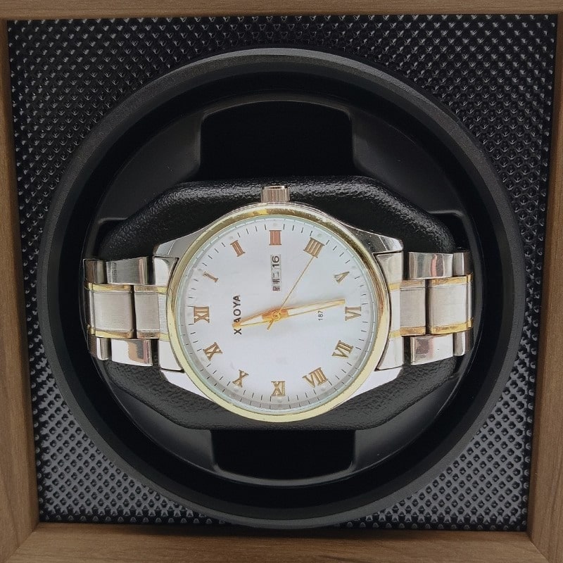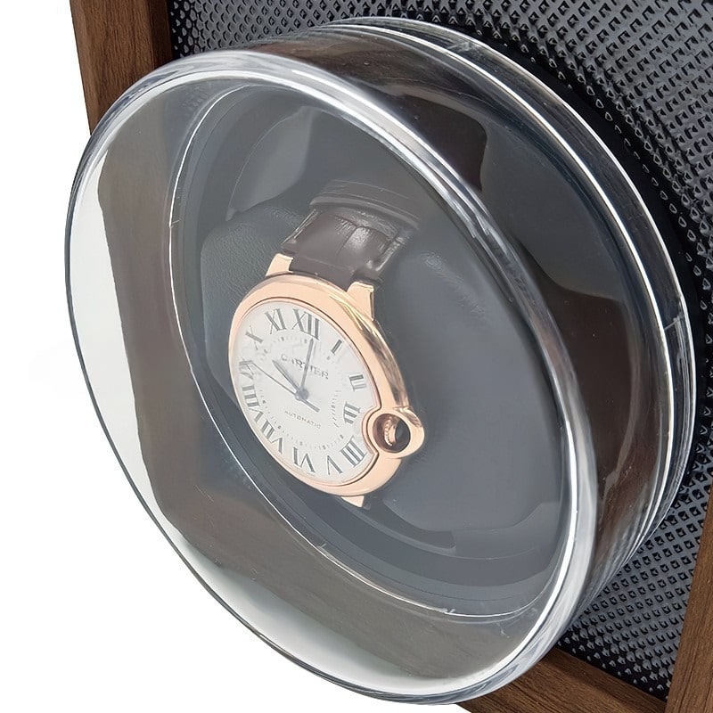1+0 黑胡桃木紋自動上鏈錶盒,提供多種旋轉模式,靈活適應不同手錶的需求,方便使用。選用黑胡桃紋木質,紋理自然美觀,質地堅硬耐用,散發著高端典雅的氣質。內置自動旋轉機制,能夠有效上鏈自動機械手錶,保持手錶運行。透明蓋設計,能360度全方位展示手錶,讓您隨時欣賞珍藏。