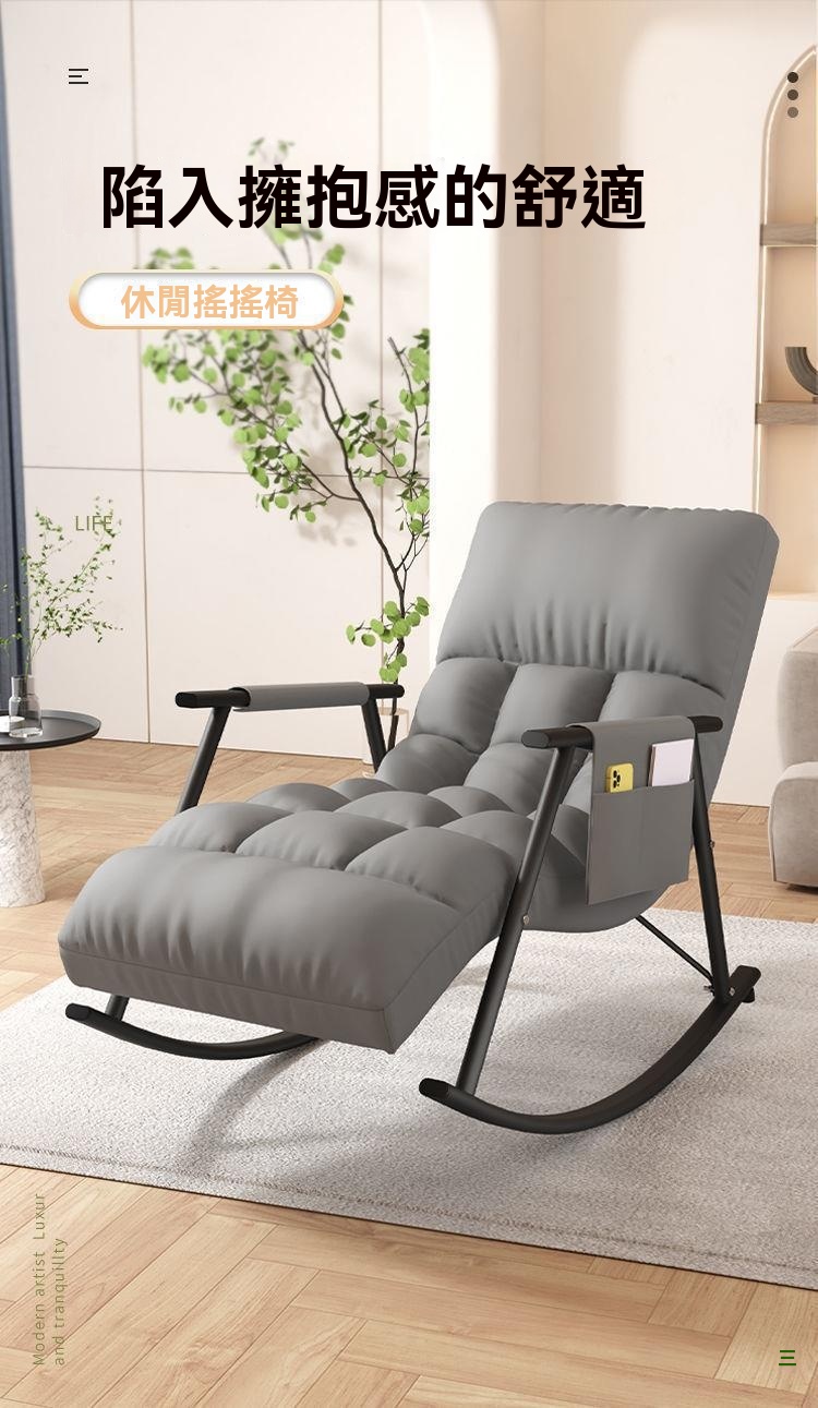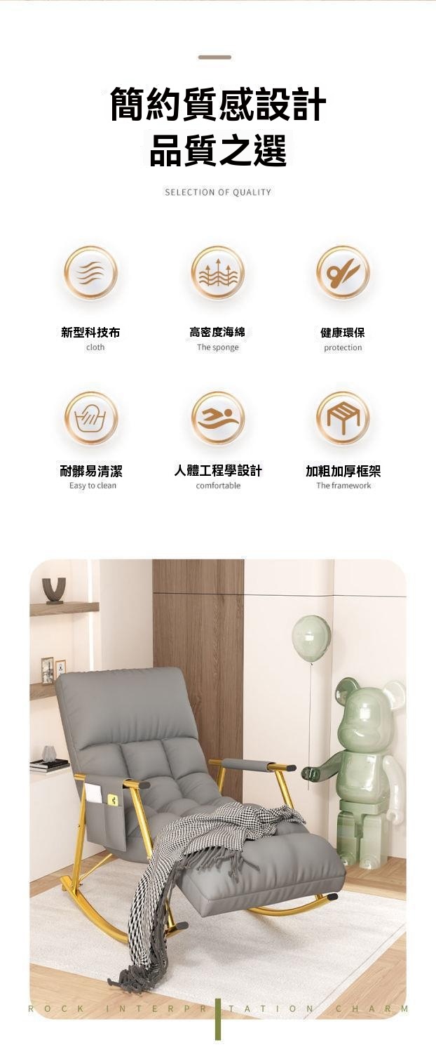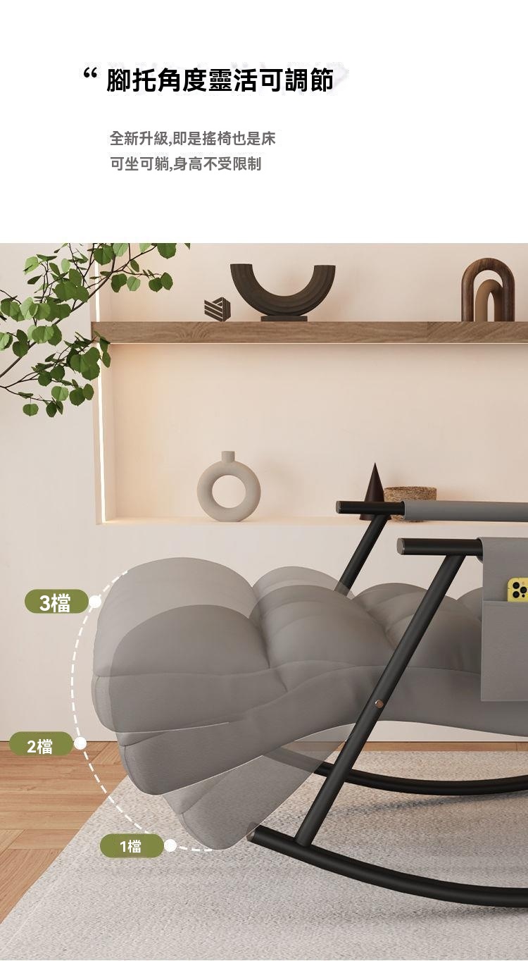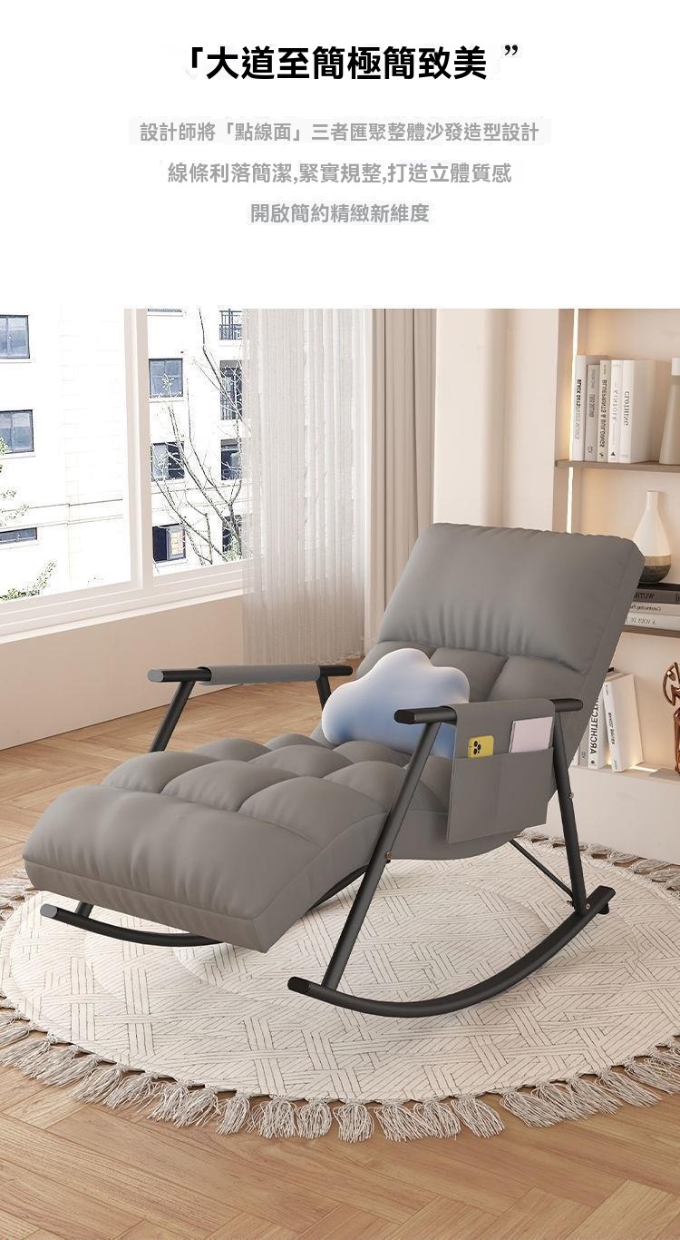 這款北歐風格休閒搖椅,採用環保PP材質與高密度海綿填充,兼具耐用與易清潔特性。人體工學設計,提供五檔可調節靠背及三檔腳托角度,無論閱讀或小憩皆舒適自在。內崁式不倒翁搖動設計,15°安全慢搖,確保使用時的穩定性與趣味性。公仔棉加海綿填充,久坐不易塌陷,柔彈舒緩,有效減輕身體疲勞。簡約質感外觀,線條利落,打造居家空間的精緻氛圍。全包科技布面料,飽滿光澤,結實耐用,讓您享受深度釋壓的依靠感。