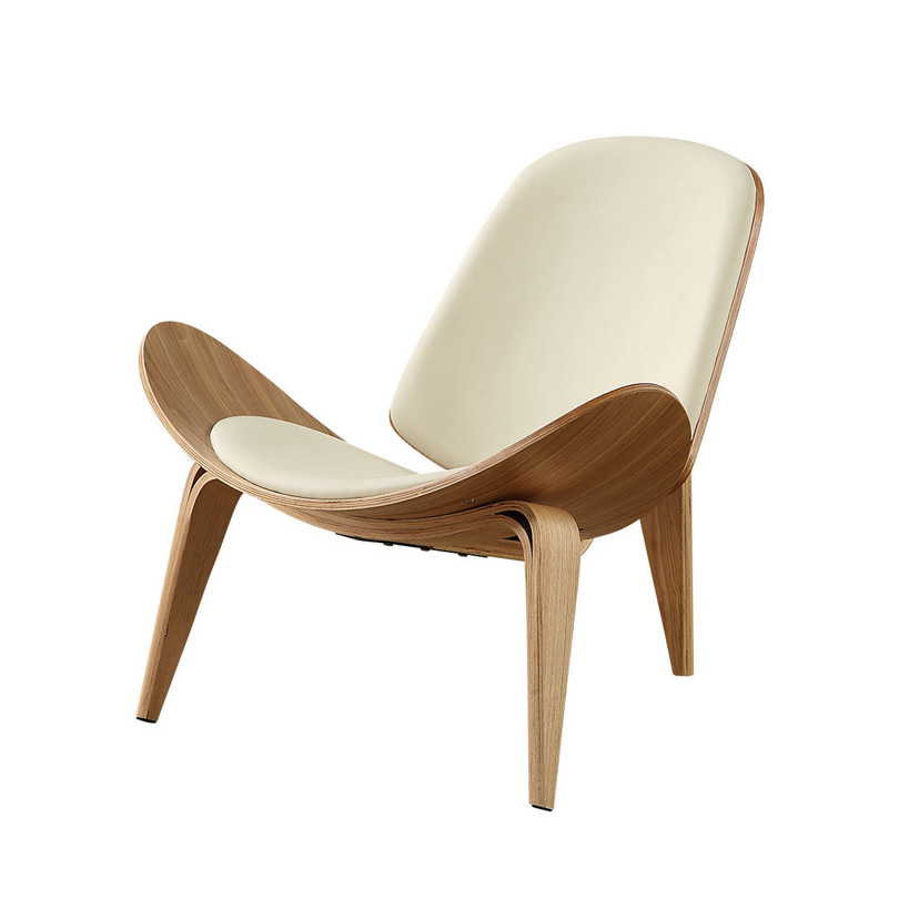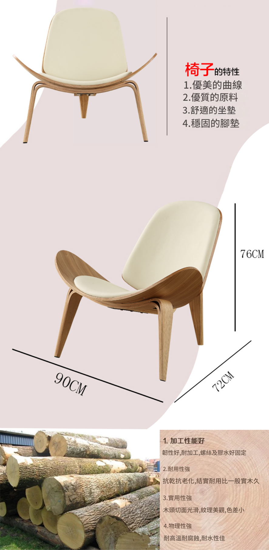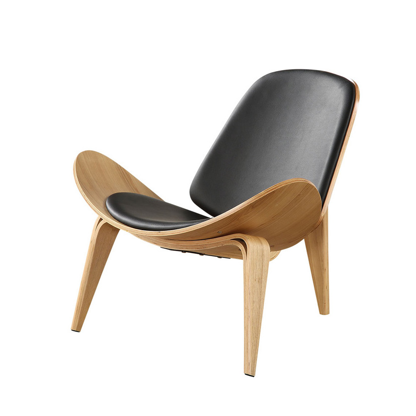 現代實木休閒貝殼椅-原木色配黑皮 | 優質原料 | 舒適坐墊 | 耐用性強