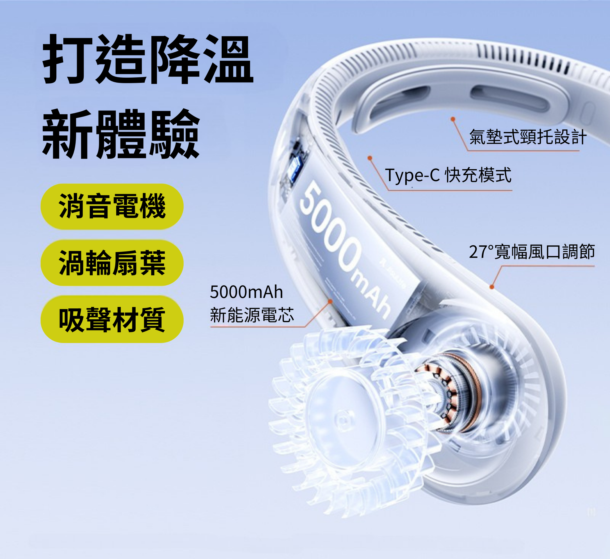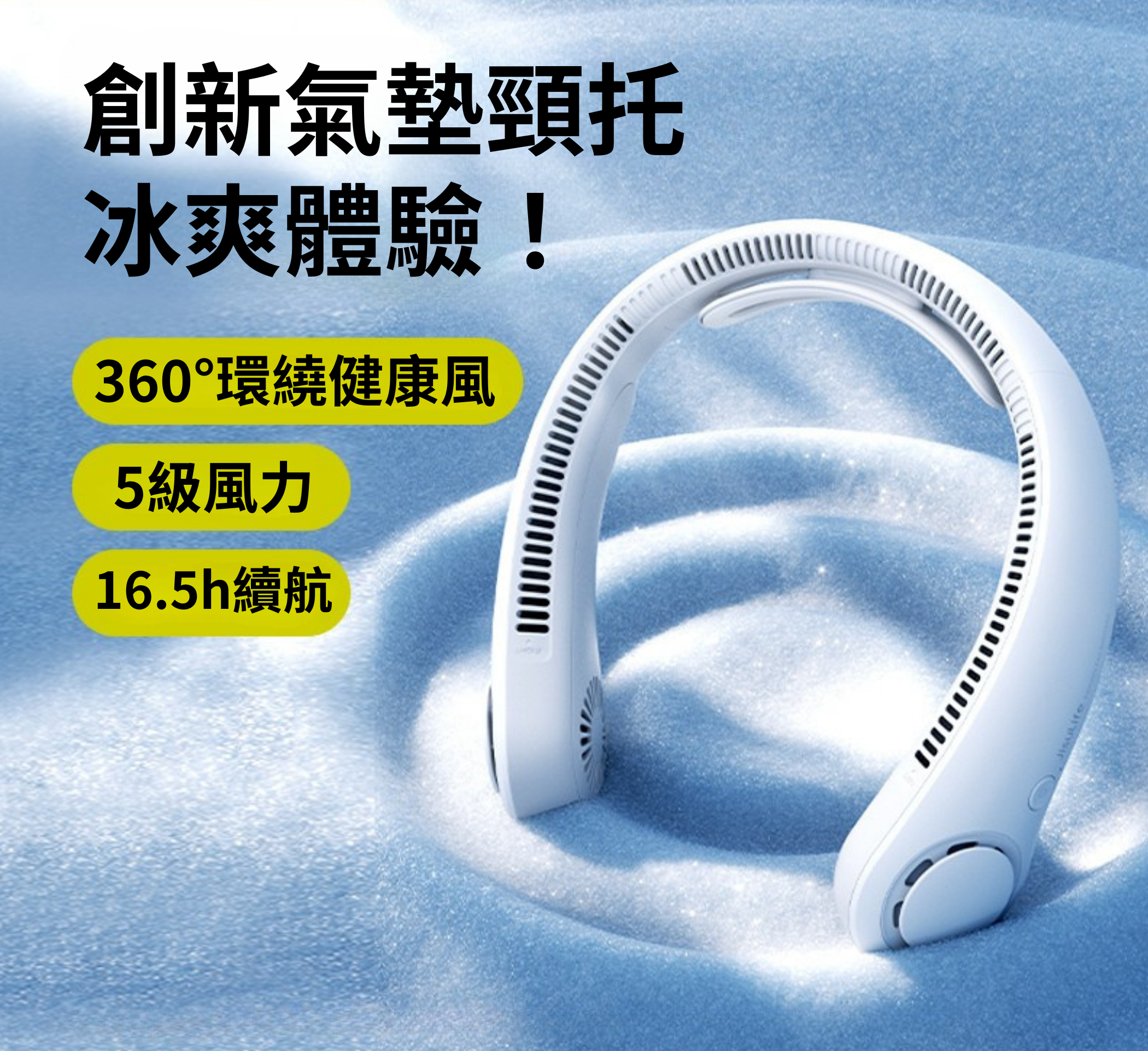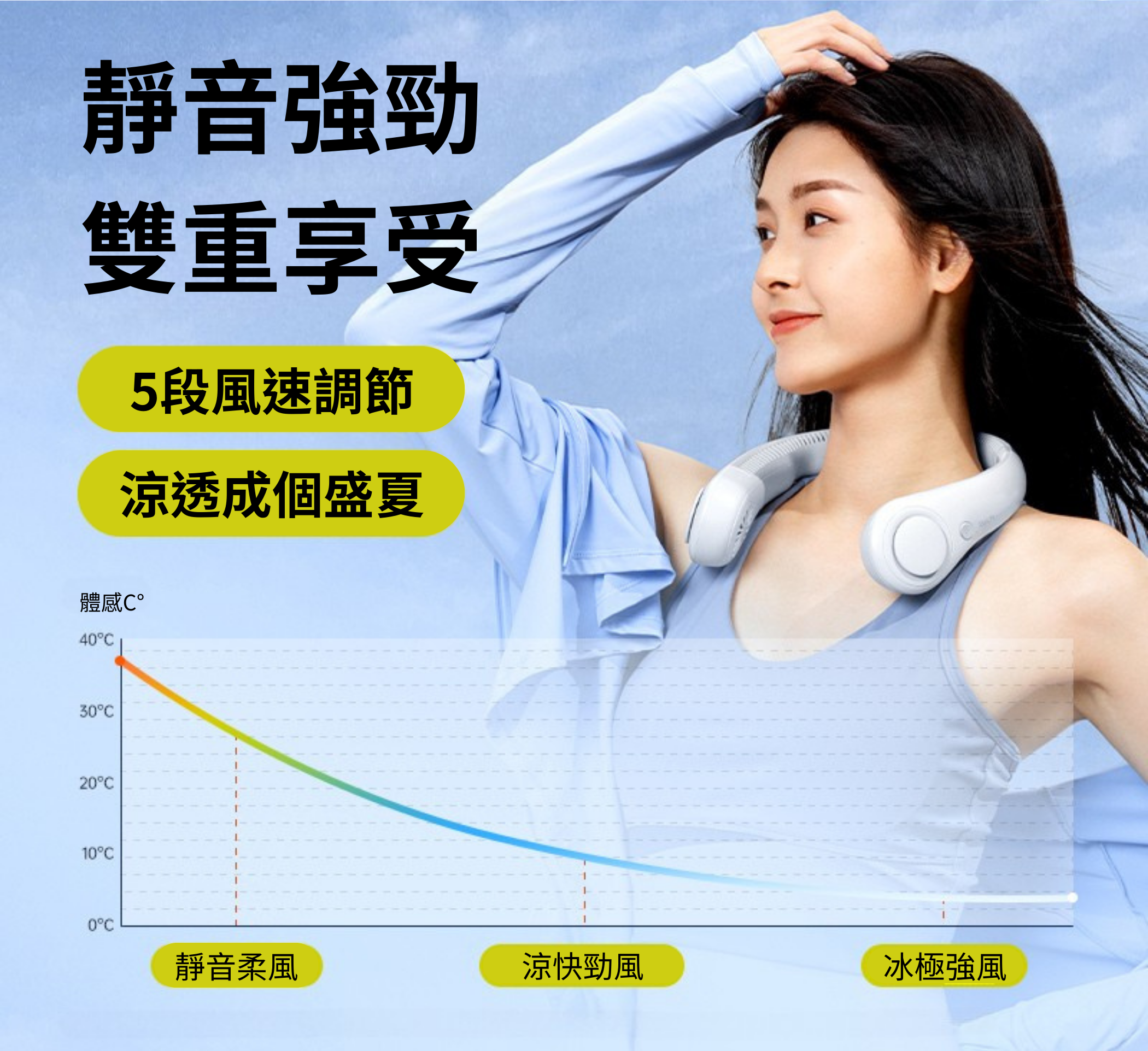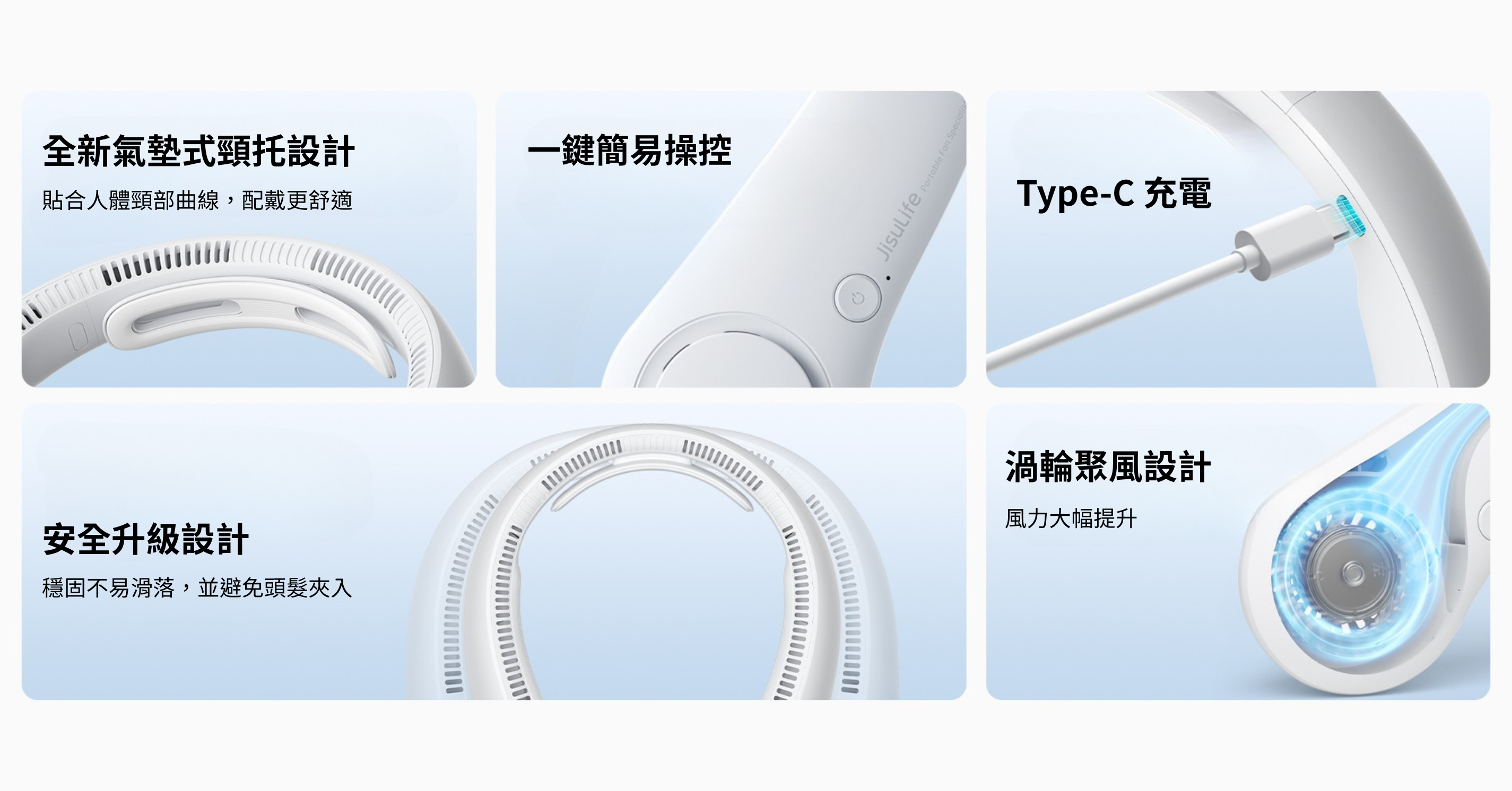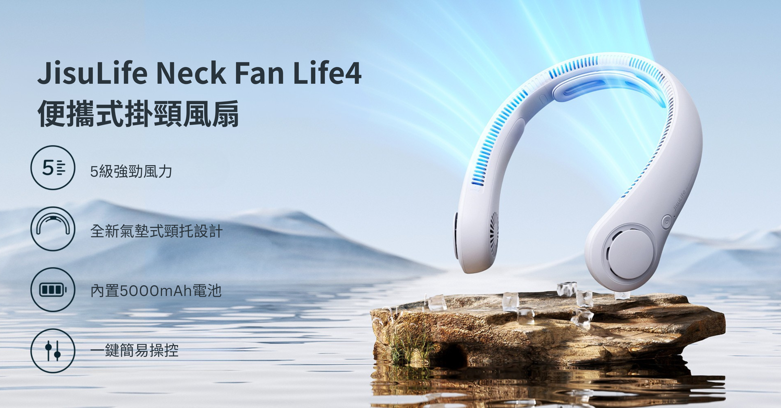 JisuLife Neck Fan Life4是一款便利實用的掛頸風扇。它貼合人體頸部曲線,升級支撐設計,配戴舒適。擁有5級強勁風力,搭載2個進氣口及80個出風口,可實現360度快速冷卻。內建5000mAh電池,續航力高達16.5小時,只需3小時就能充滿電。採用免提昇級設計,穩固不易滑落,也避免頭髮夾入。經典設計風靡全球,融入時尚潮流元素。升級馬達技術,運轉噪音低至25dB,安靜舒適。無論是出遊、運動或日常,都能為你帶來清涼體驗。